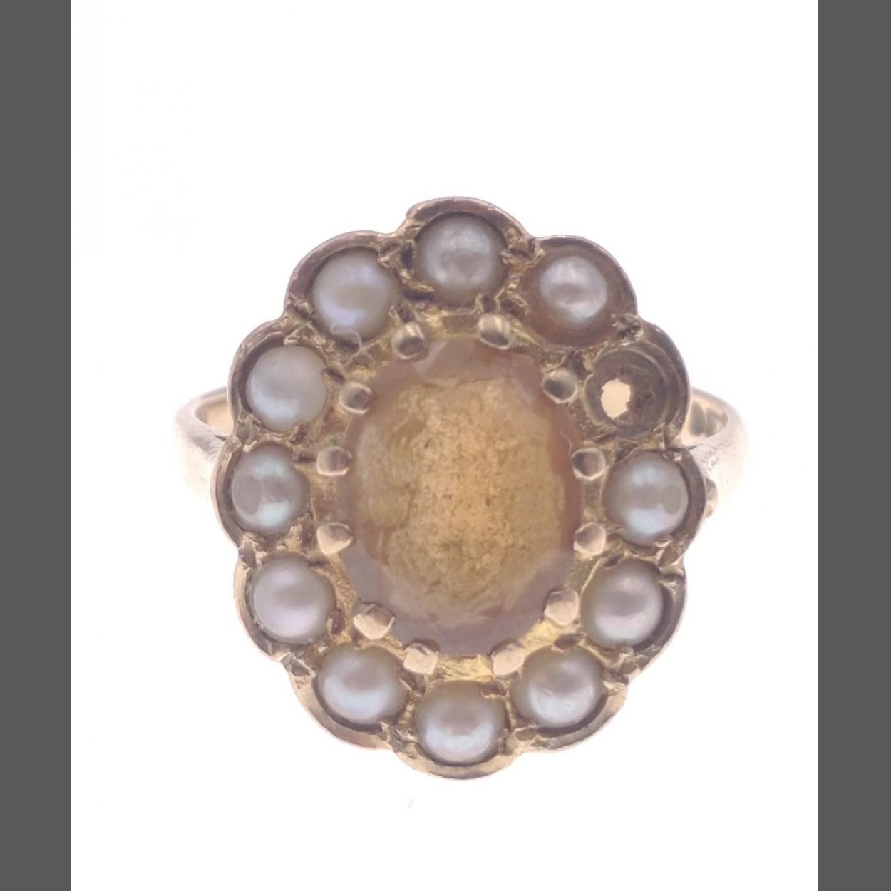 A vintage 375 stamped yellow gold dress ring with an agate centred stone surrounded by tiny seed pearls, all in flower form - ring size M - 5.48g gross approx - alas one seed pearl missing