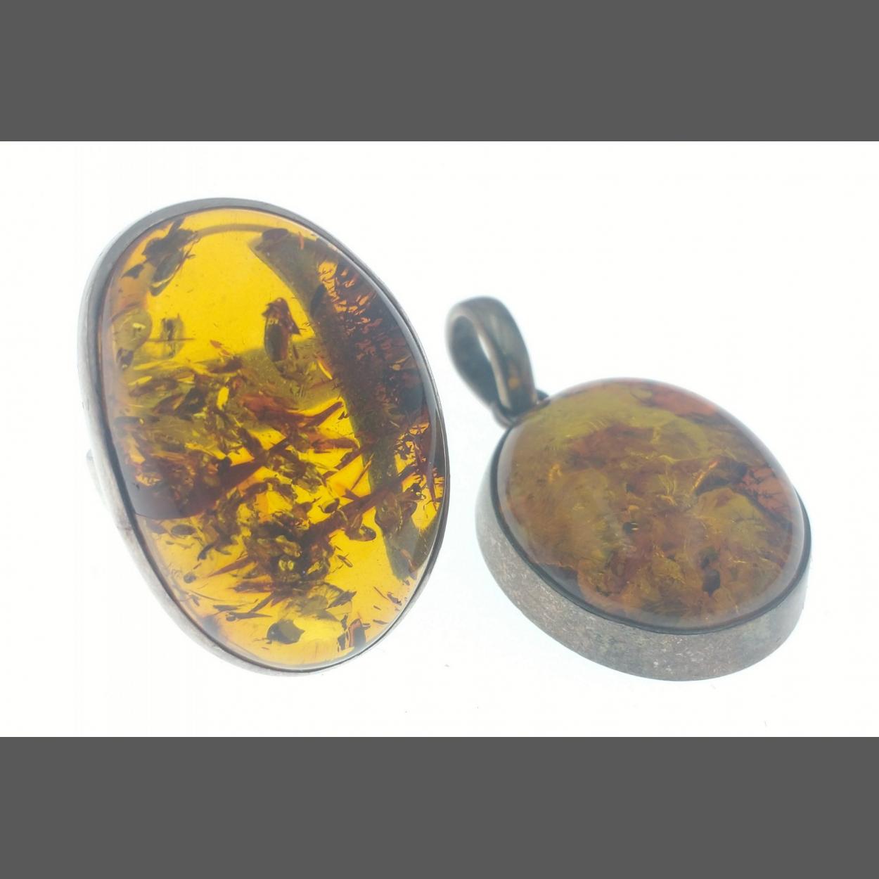 Two pieces of amber jewellery both stamped 375, being a ring with a large stone 3cm long size O and a pendant 2.5cm long gross weight 21.7g