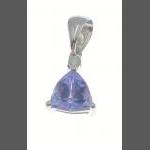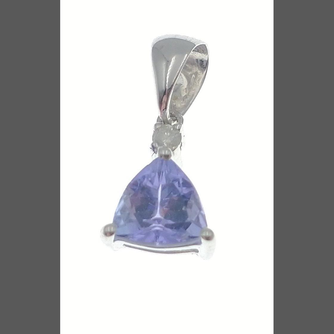 A 14KT white gold pendant 1cm long with a clear white stone and a triangular purple one, weight 0.5g
