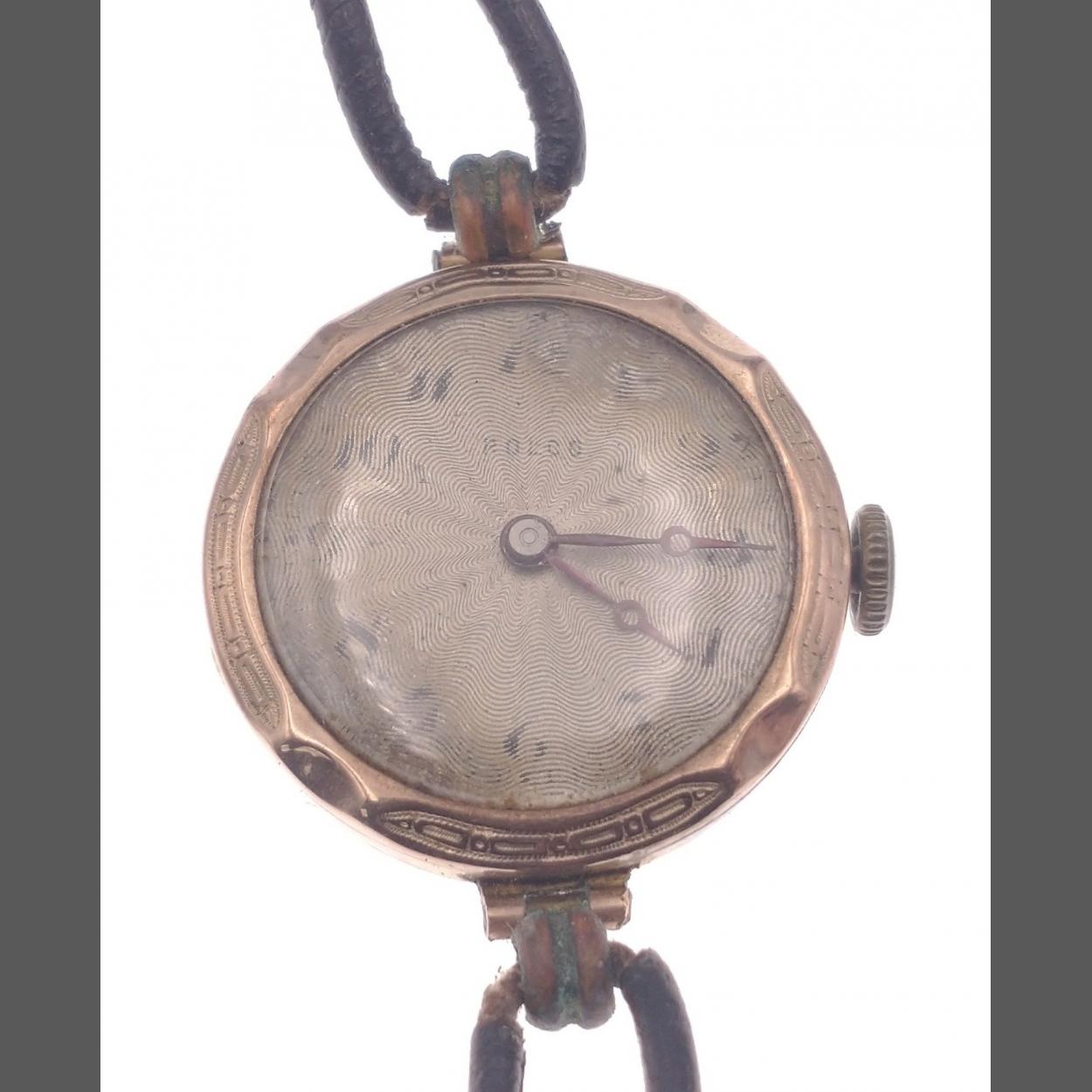 A vintage ladies watch by ROLCO with 9ct gold hallmarked case, Swiss made with 15 rubies and leather strap face measures 2cm approx, not working