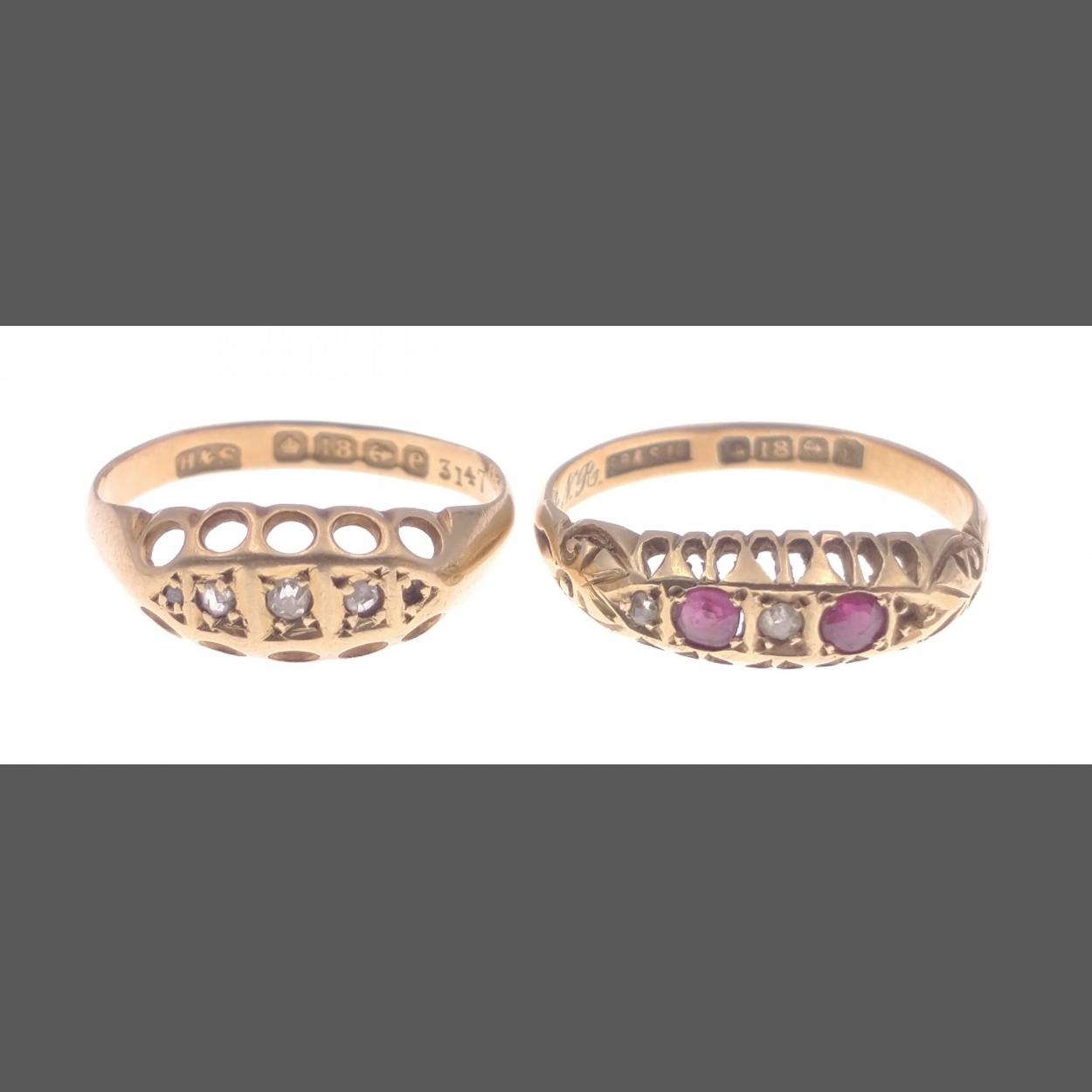 An 18ct Hallmarked stamped ring size N with small diamonds(tested) 1.73g gross weight approx with also an 18ct stamped ring with two small garnets and two small diamonds(tested) ring size N weight gross 2.19g approx - total gross weight 3.83g approx