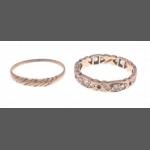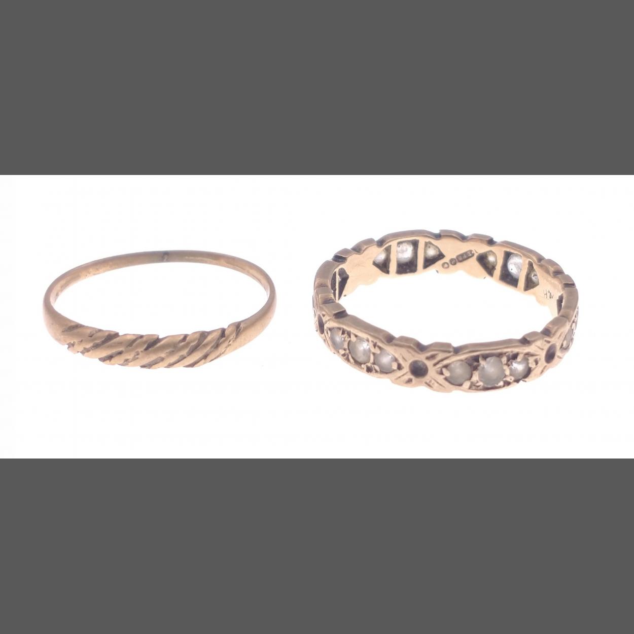 A 375 stamped yellow gold eternity-style ring with small white stones inset ring size N/O gross weight 2.16g approx and one other unmarked 'yellow metal' thin banded ring .58g weight approx ring size L