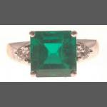 LARGE COLOMBIAN EMERALD! 18ct(750 stamped) yellow and white gold ring with a 4ct Colombian Emerald set with 2 diamonds, (tested) Size N specially made in Dubai (7.8g gross weight) - emerald dimensions 8mm x 8mm approx