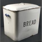 A large vintage ENAMEL Bread Bin 32cm tall 35cm long and 25cm deep the enamel has some chips and cracks however still very useable and looks the part in any kitchen