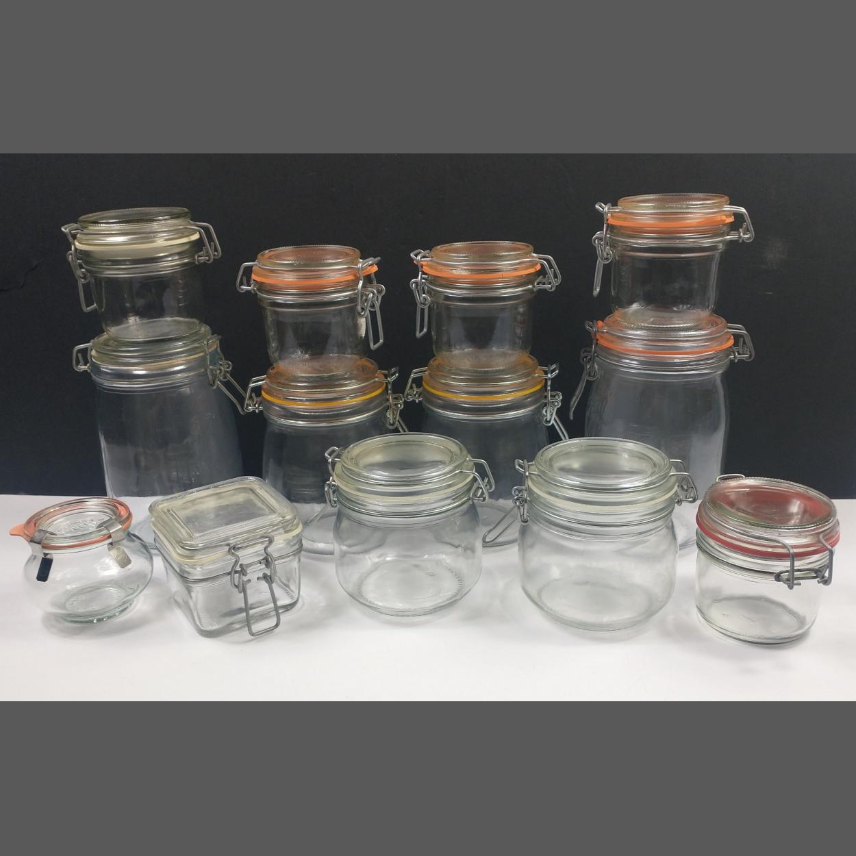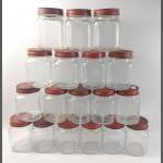 Eighteen vintage glass storage jars each with red metal lids, great kitchen storage, all the jars have squared edges so will fit compactly on kitchen shelves stands approx 16cm high lid diameter 10cm