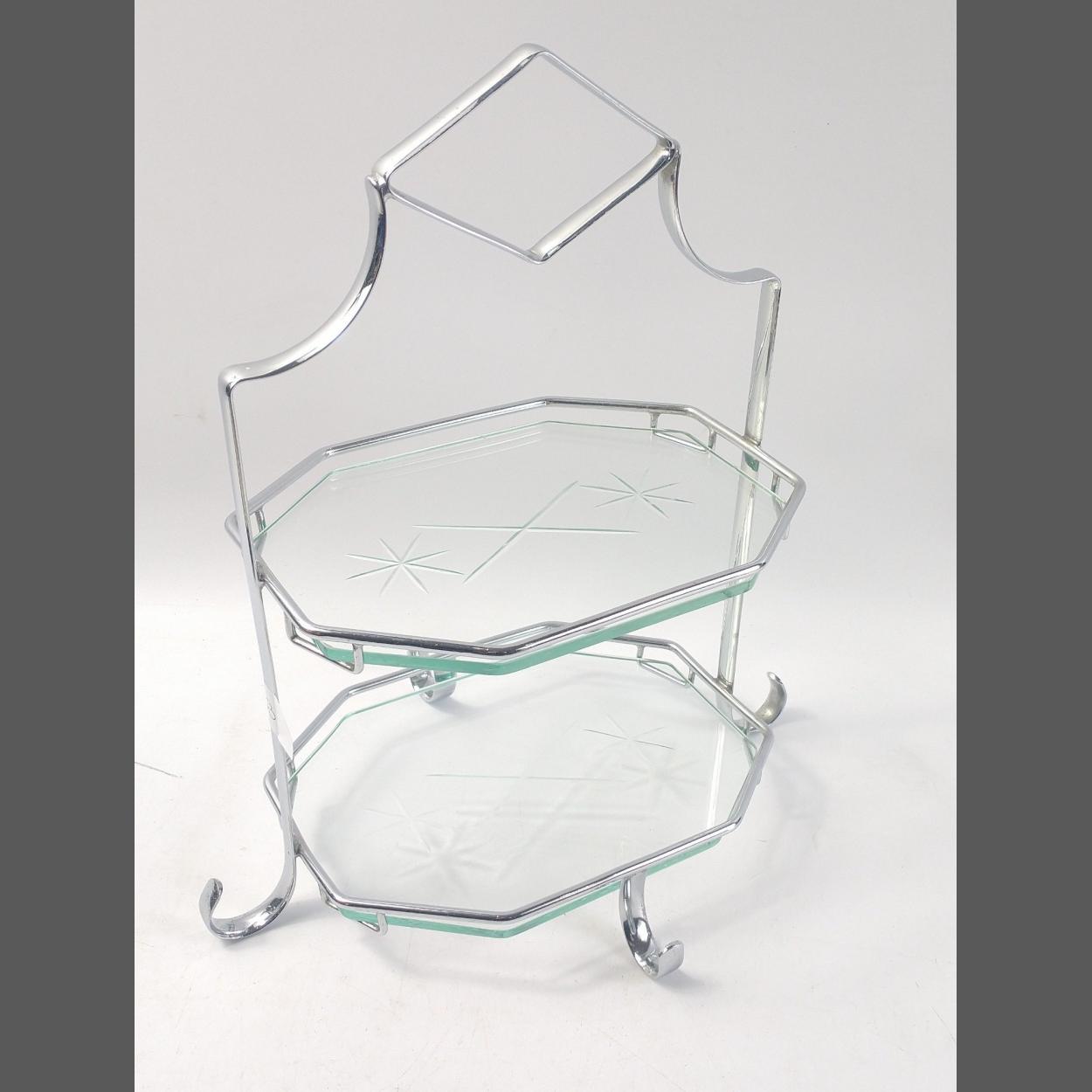 An ART DECO cake stand with 2 glass shelves, stands approx 35cm high, width at base approx 30cm