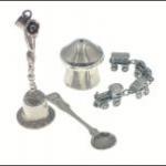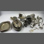 Four items to include a MAPPIN & WEBB monogrammed silver salt cellar (Sheffield 1997) only 3cm tall, a condiment spoon stamped silver 6cm long approx, a train with engine and 3 carriages stamped 925 7cm long approx, and a white metal bell with long handle 6cm approx, weight for first three items 30.63g