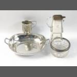 A small selection of SILVER PLATE items to include a twin handled dish 26cm handle to handle , a small embossed mug , a cut glass bowl with EP rim and a cream jug with matching sugar bowl