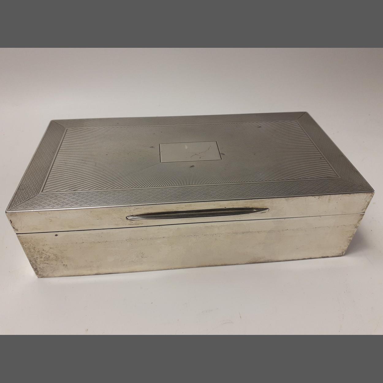 A stunning large engine turned SOLID SILVER cigarette box by PB Ld. of London and hallmarked 1909. 18 x 9 x 5cm approx. scratch to cartouche and some minor dents but overall a very appealing and attractive high quality item. Hinged in good order and closes very nicely, cedar lined and base weighted. Gross weight 577g