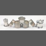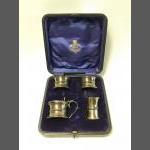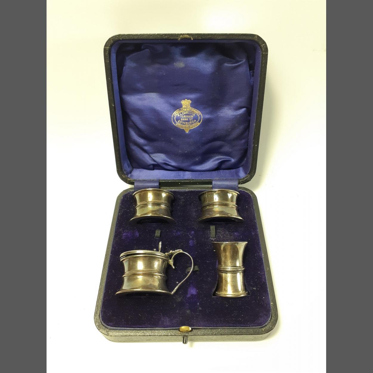 A gorgeous cased Solid Silver Cruet Set in a very nice original Edinburgh retailer’s box. Each item carries matching Birmingham hallmarks and a Registration mark dating to 1907. The lidded pot and the two open ones each have a lovely intact Bristol Blue liner. The spoons are missing. Combined gross silver weight without liners is 57g. A very appealing set.