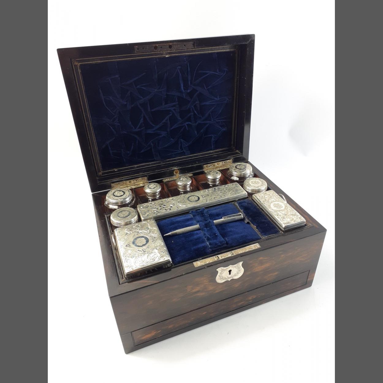 VICTORIAN CORAMANDEL WOOD VANITY CASE of the absolute finest quality, fully complete with matched bottles and silver tops all carrying matching young head Victorian hall marks for London 1868. All hallmarks are W.N. for William Neal. Incredible that all the bottles are still in place, undamaged and the three smaller bottles even have the internal glass stoppers. Note the quality that even the escutcheons, lock plate and the hinges are engraved silver albeit without hall marks. The lid interior has a small brass button which enables the mirror to be shown or reversed to display the lovely rucked blue velvet cloth. The button on the rear middle pops out the secret bottom drawer with a lovely firm and smooth motion. The two side lifting handles for the internal tray are still in place and the tray fits beautifully. Measures 30 x 23 x 18 cm approx. The lid lock plate is missing and there is no key. The ladies silver pocket watch and silver hallmarked propelling pencil are clearly later additions. Surely one of the finest examples currently available.