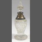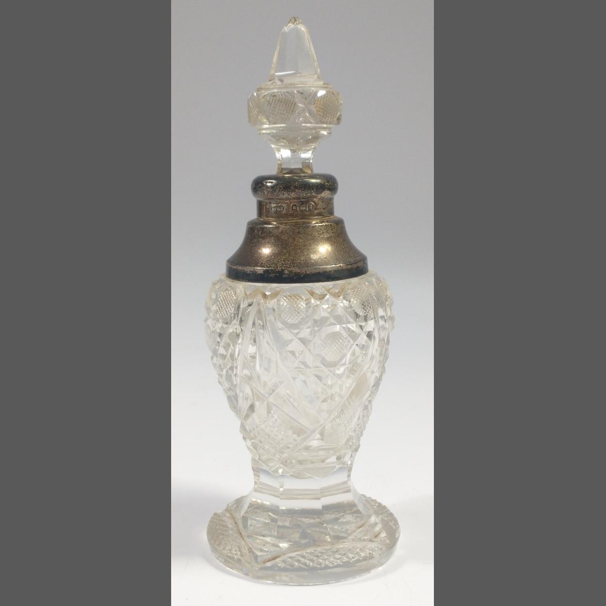 A cut glass PERFUME bottle with a SILVER collar by Henry Perkins & Sons of London hallmarked in 1923 , the bottle stands 16.5cm to the top of the stopper and is in good condition with no chips or cracks