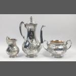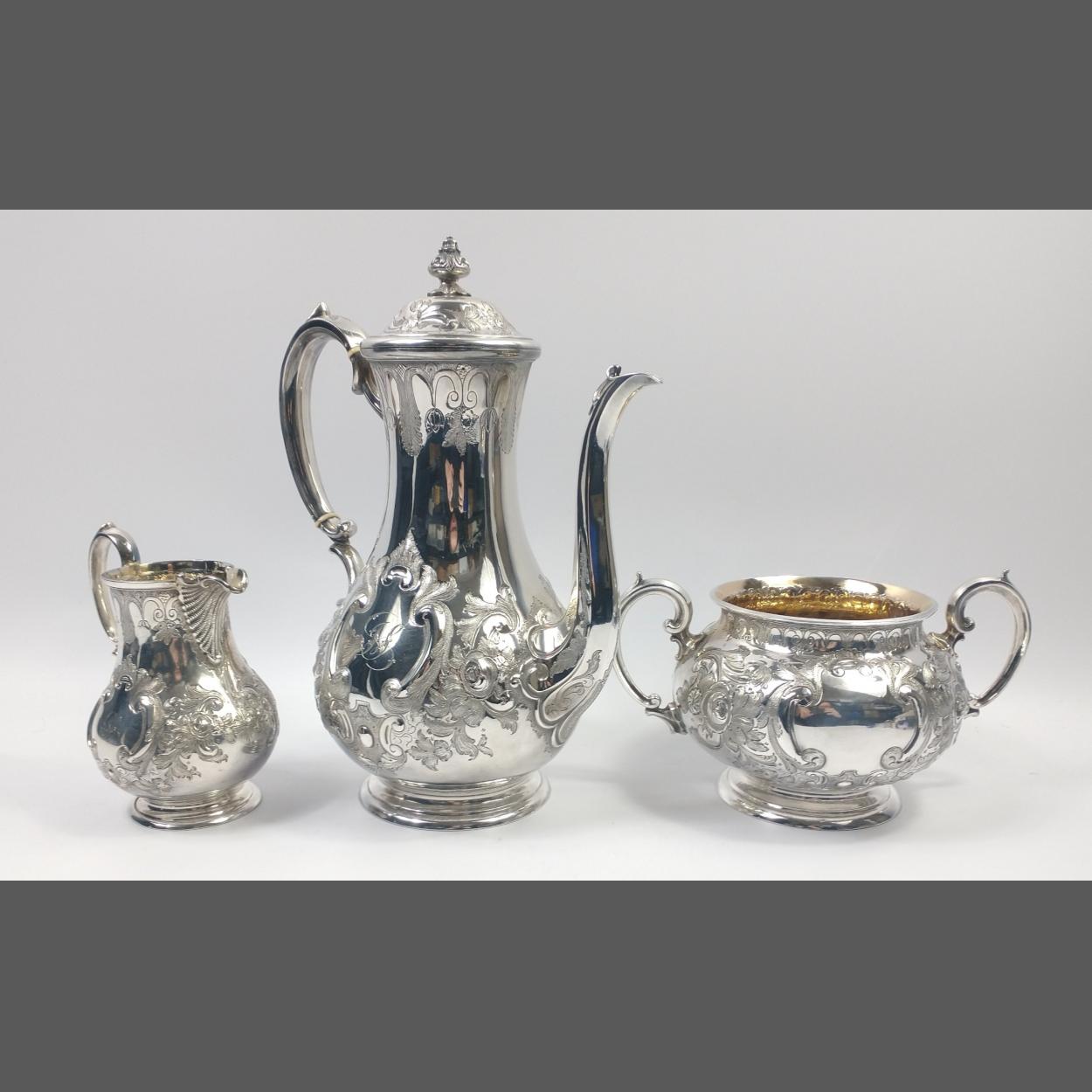 A quality 3 piece SILVER PLATE Coffee Set by Martin Hall & Co comprising of a 28cm tall coffee pot , a large twin handled sugar bowl and a cream jug