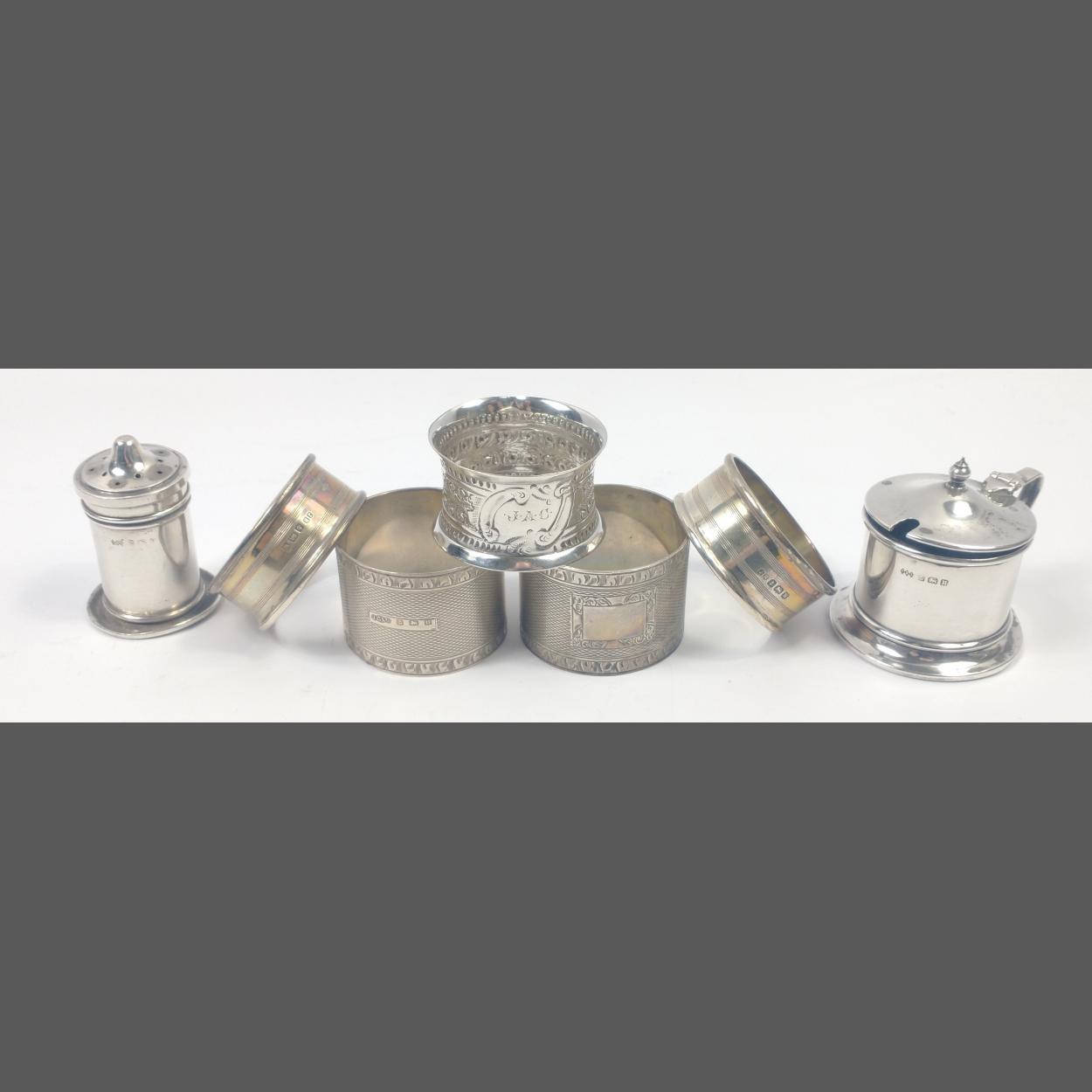 A selection of assorted SILVER including 5 silver napkin rings and two cruets with blue glass liners , with a GROSS weight of 200g