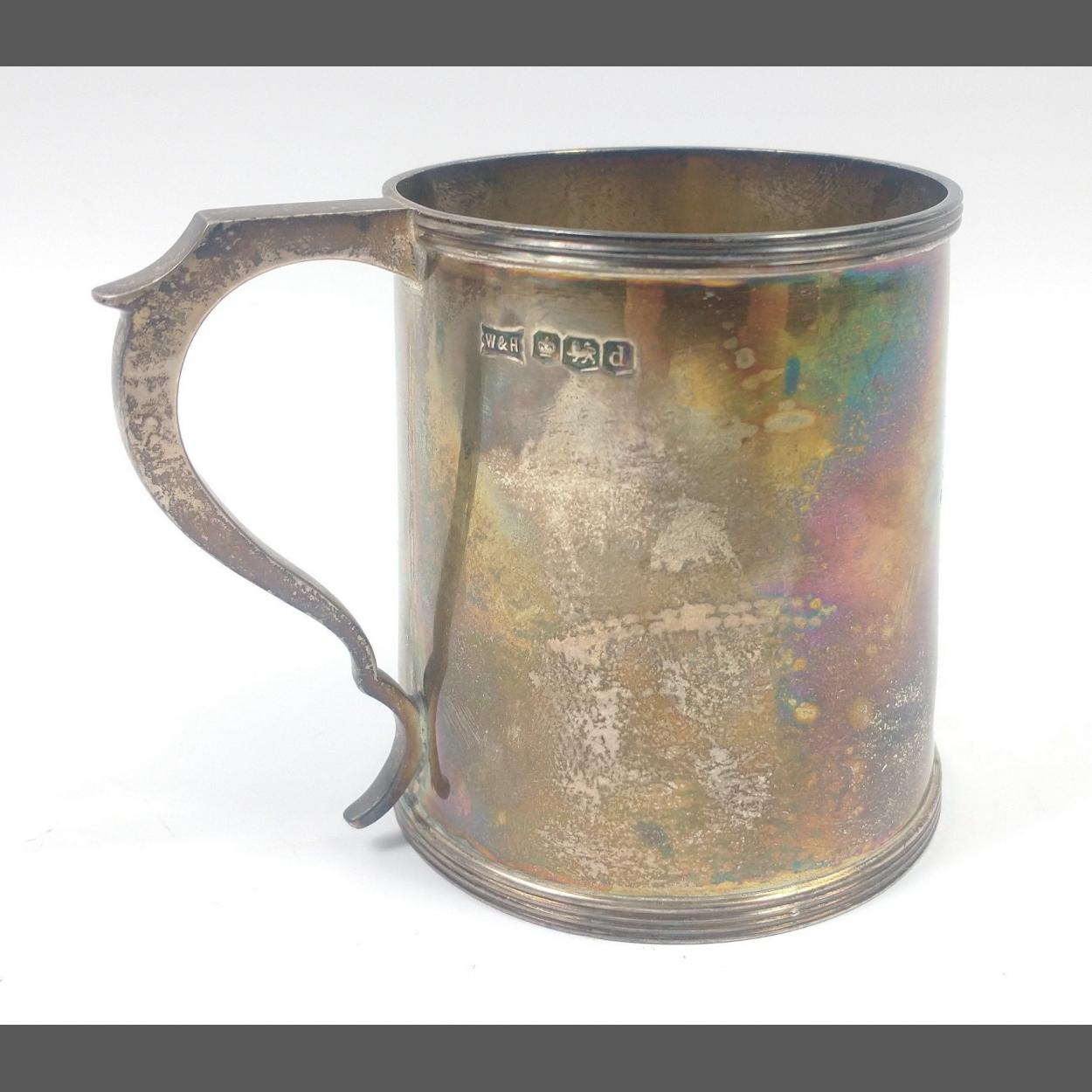 A small SILVER christening mug by William Hutton & Sons Ltd fully hallmarked for Birmingham 1926 , the mug stands 8cm tall and weighs 130 grams