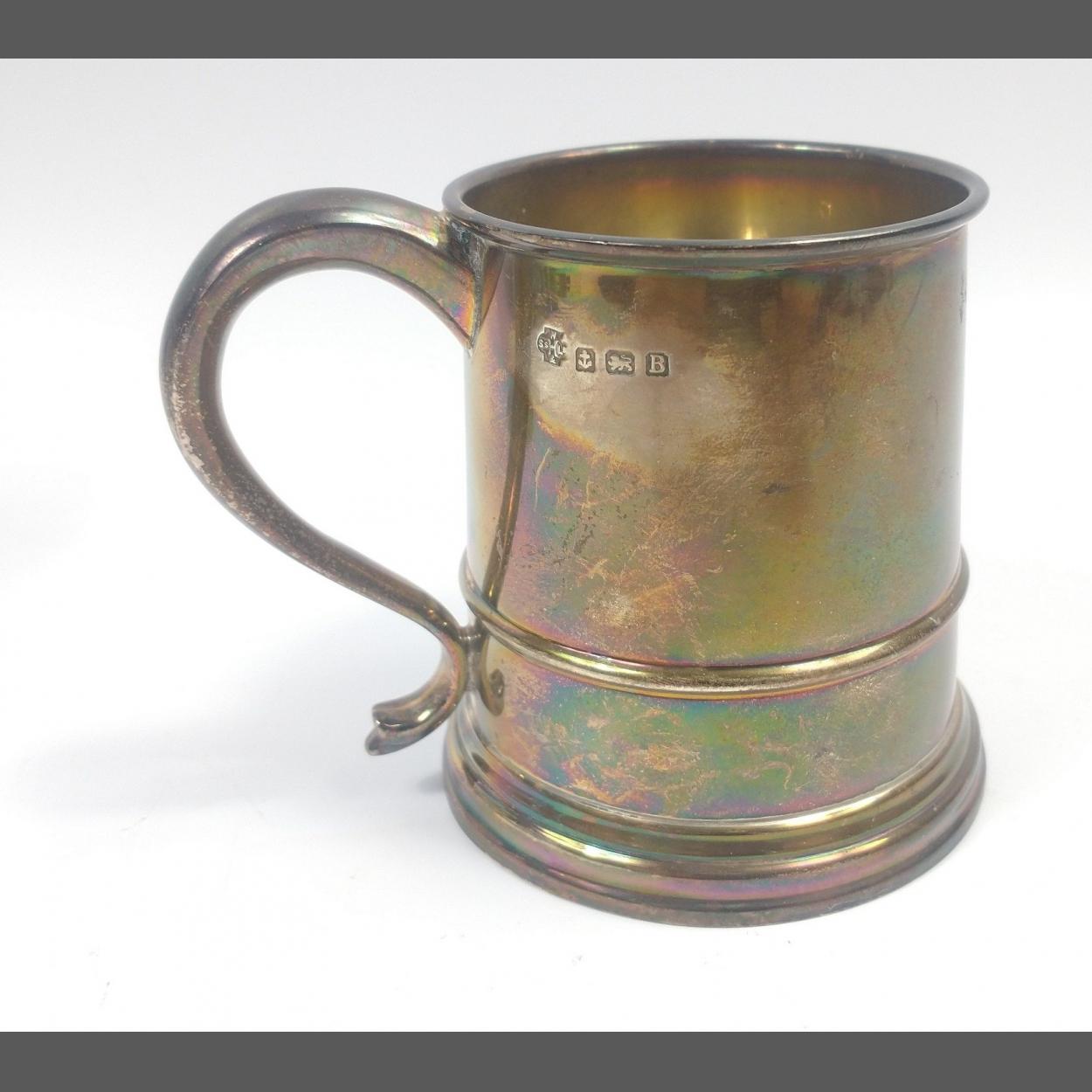 A small SILVER tankard by WALKER & HALL fully hallmarked for Sheffield 1921 , the tankard weighs 175 grams and stands 8cm tall , it has a dent to the front below the inscription