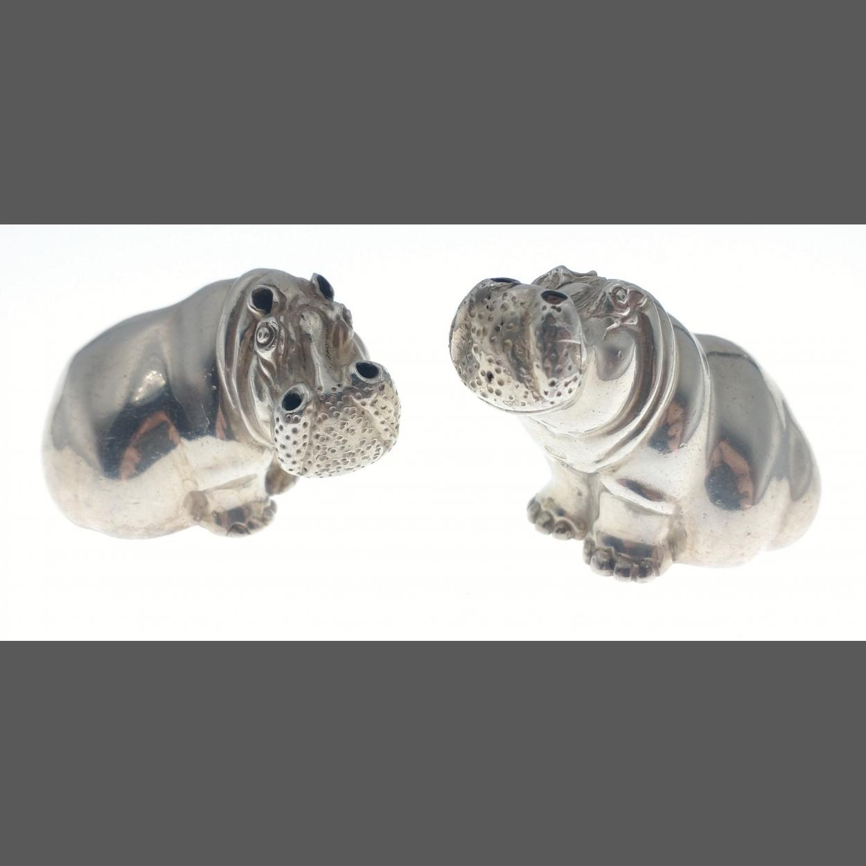 A pair of unusual hallmarked silver salt and pepper pots in the form of Hippos by PATRICK MAVROS of Zimbabwe, stand only 4cm tall, weight 128g