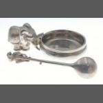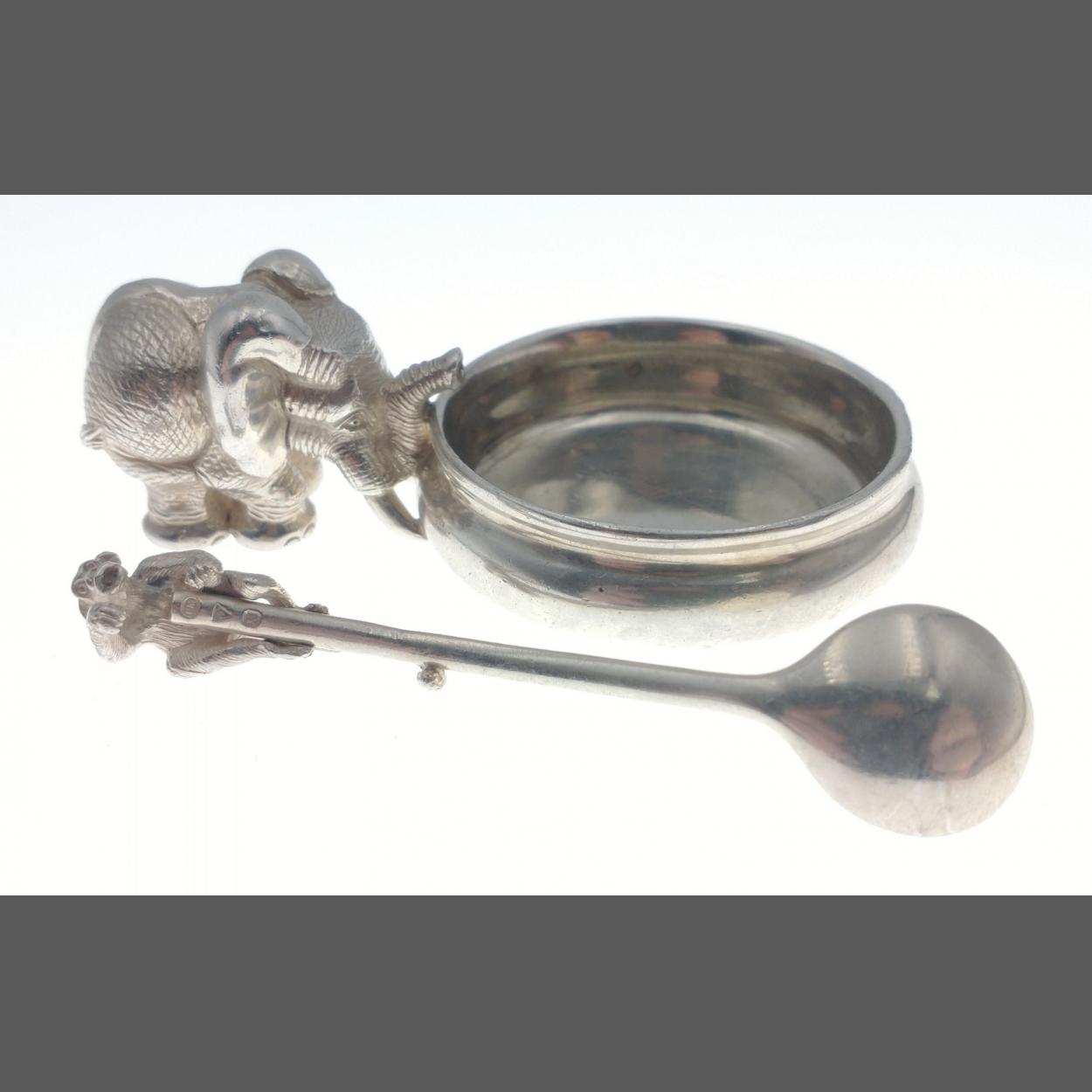 A sterling silver elephant mustard pot comes with spoon with a monkey handle by PATRICK MAVROS of Zimbabwe dish diameter 4.5cm approx, spoon approx7.5cm, weight 147.7g
