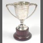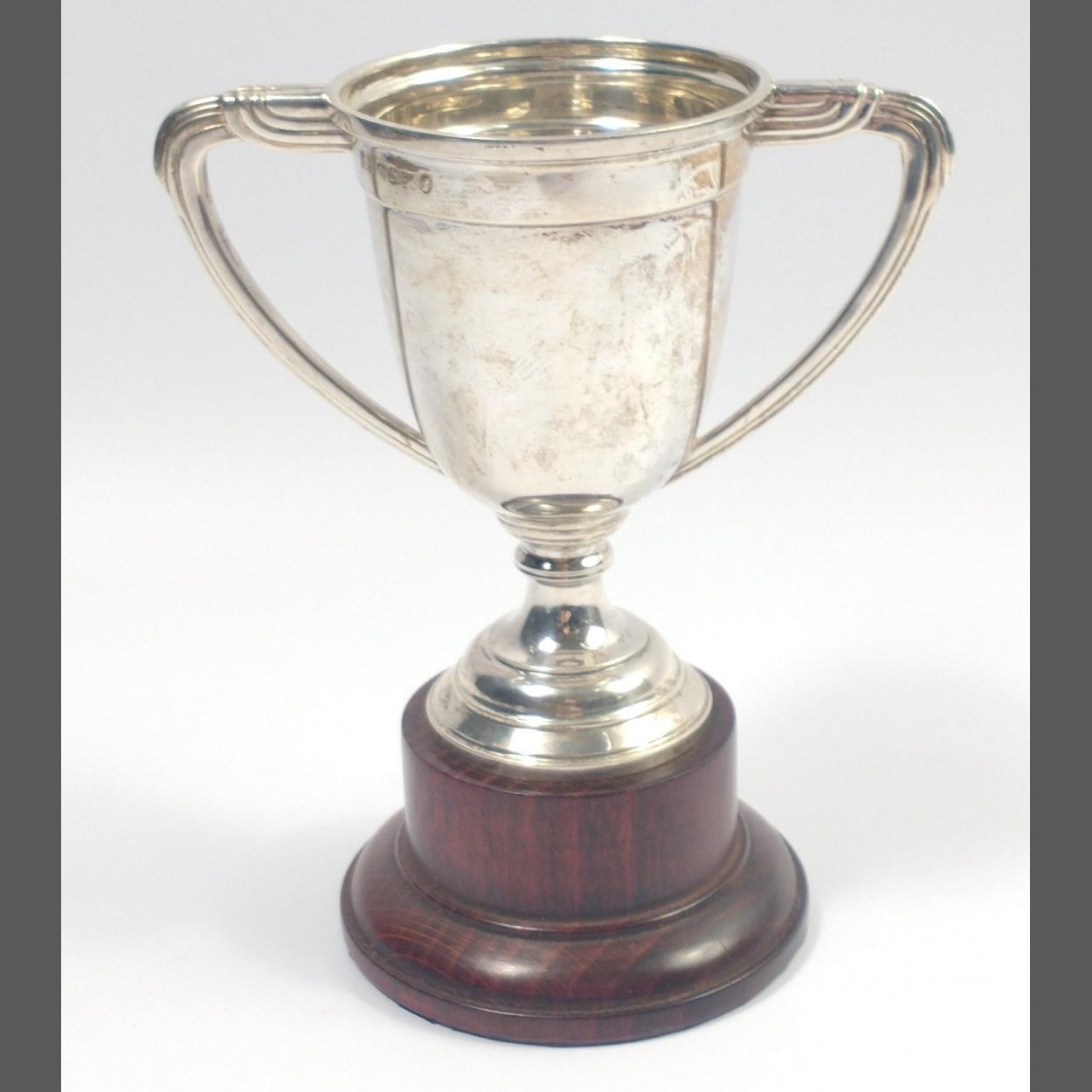 A small silver hallmarked cup (Edinburgh 1945) without an inscription, made by HAMILTON and INCHES, stands 10cm tall, weight 83g with a wooden stand labelled Hamilton & Inches, a few very small dents in cup
