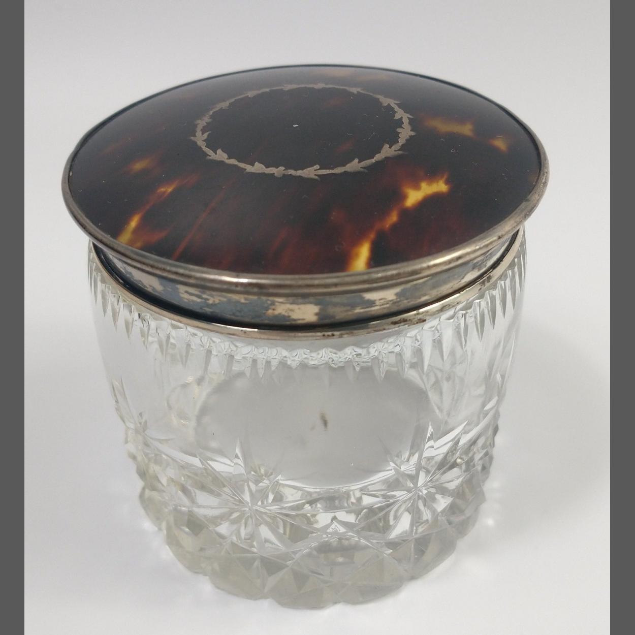 A small dressing table pot standing 7cm high dia 6cm with tortoiseshell lid with silver hallmarked collar (Birmingham 1923)