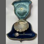 A scalloped silver Sheffield 1888 Hallmarked dish weight 56.55g approx within its original presentation case, the small knife is missing but has been replaced by an UNUSUAL Georgian silver coin hammered into spoon form with a twisted stem handle 10.27g approx