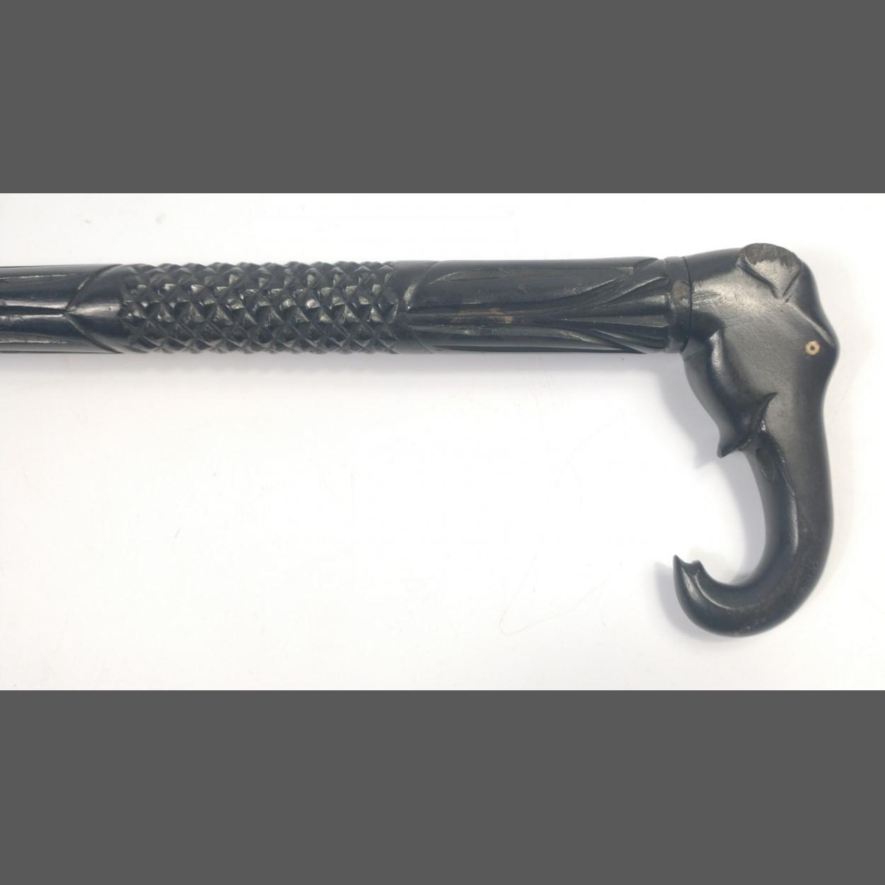 A rather attractive ebony walking stick with an elephant head handle and part carved shaft, 89cam long