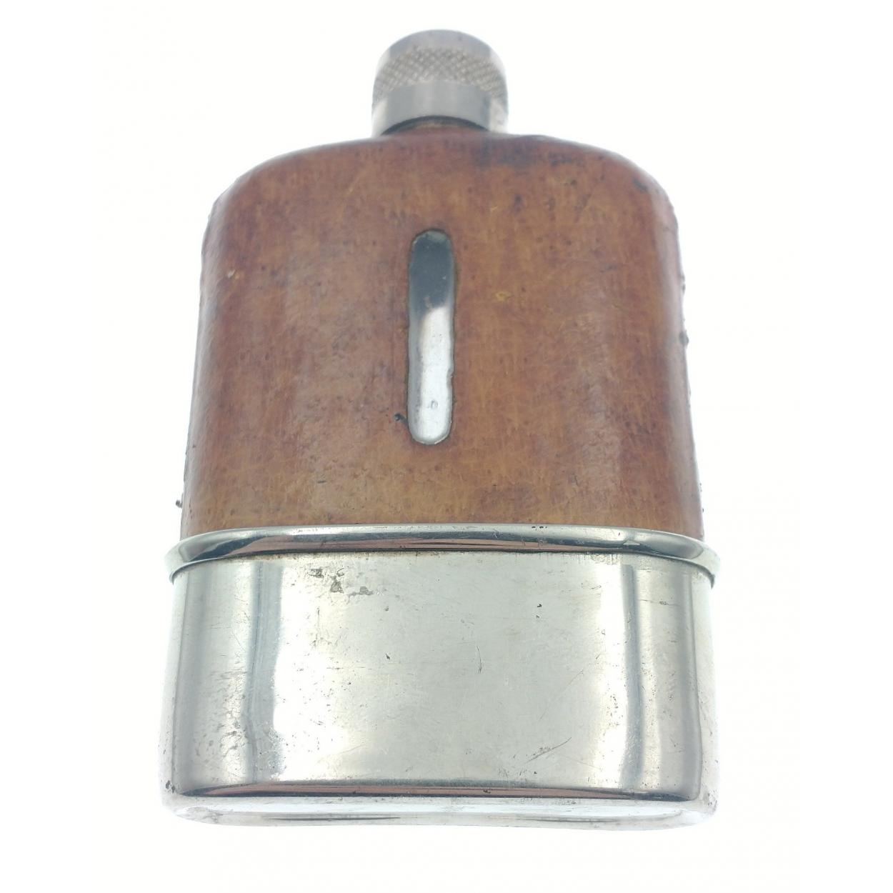 A lovely quality wee leather and white metal covered hip flask - dimensions 10cm height x 6cm width