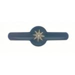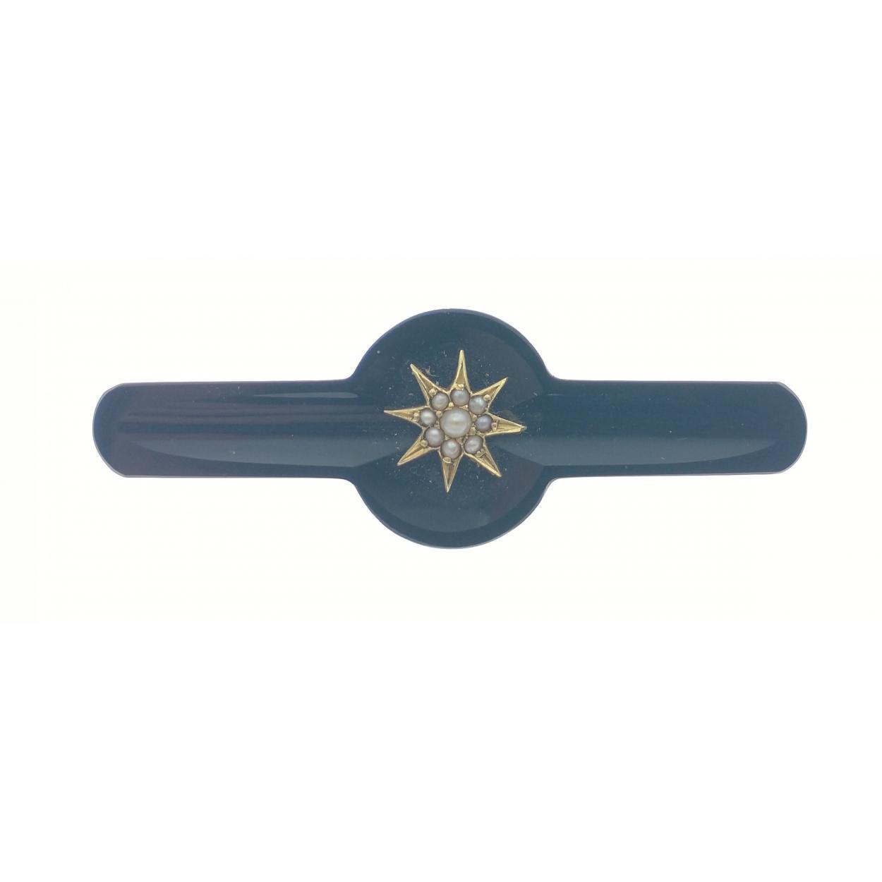A small yet appealing black stone brooch possibly polished jet? with gilt and seed pearl star motif in centre. A very beautiful little unmarked item. 5cm long approx. Gross weight 5.7g approx.