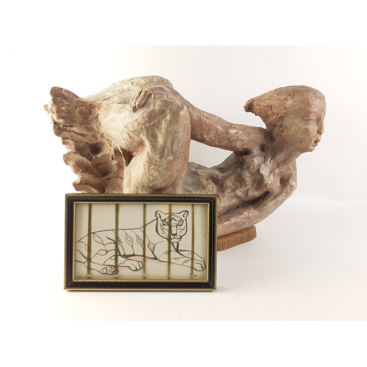 Sculpture by SYDNEY BIRNIE STEWART of a ‘Reclining Woman' on a wooden base to match the outline of the sculpture - dimensions 19” length x 10” height approx Very Slight damage to the tip of the nose noted, but this does not detract from the overall beauty of this item! with also a framed drawing by Elizabeth Koster (sculptor's wife) ARCA ARBS entitled White Tiger' 10.5" x 18.5" - entry No 14 June 1985 Gladstone's Land Gallery Lawnmarket Edinburgh