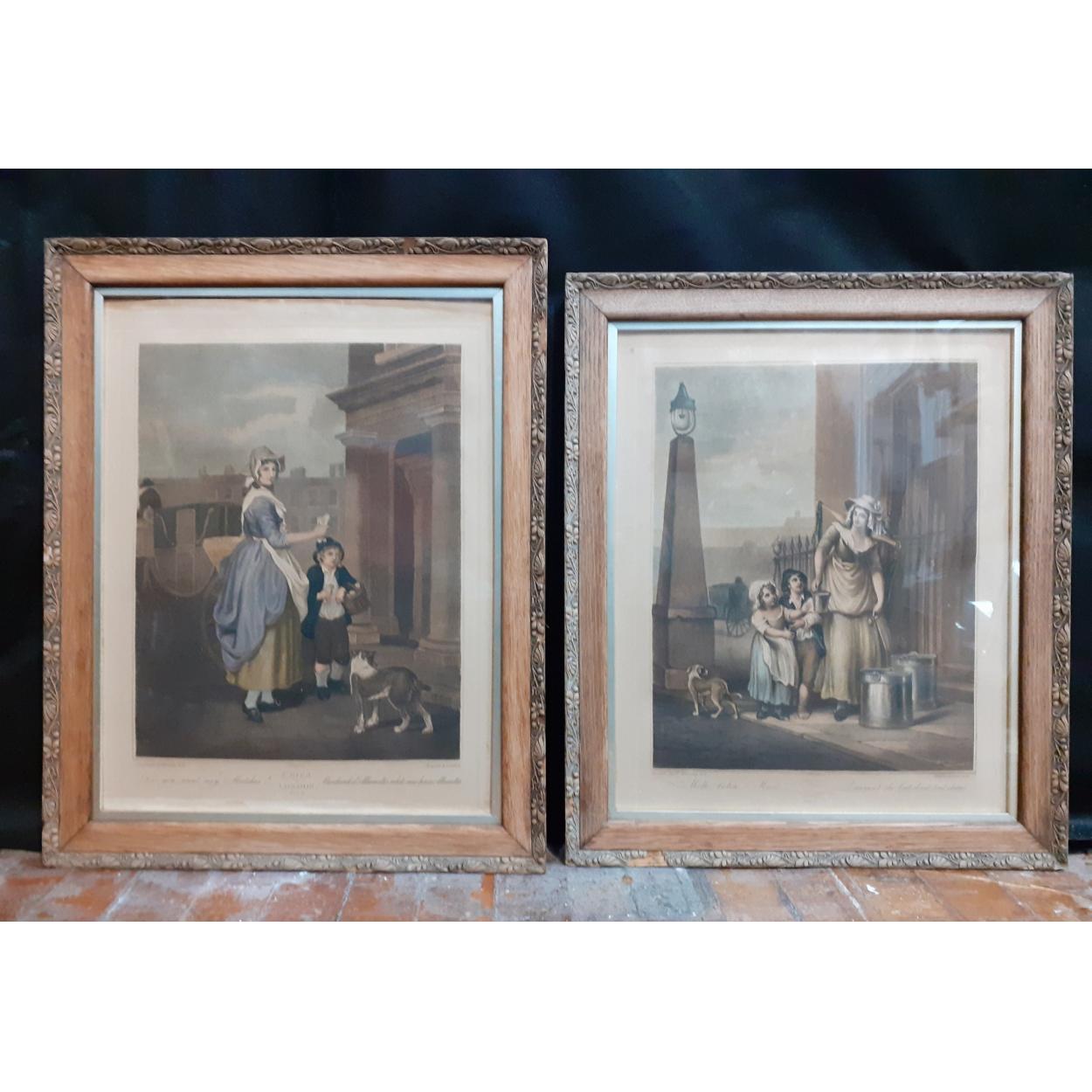 Two c. 19th century E. Wheatley colour lithographs featuring Plate 4 'Cries of London' - Do You want Any Matches?" in the style of Artist A. Cordon and another colour lithograph Plate 2 'Milk Below Maids' in the style of Schiavonetti. Ornate wooden frame size of each approx. 42cm width x 52cm height. Print sizes measure approx. 27cm width x 34cm height.
