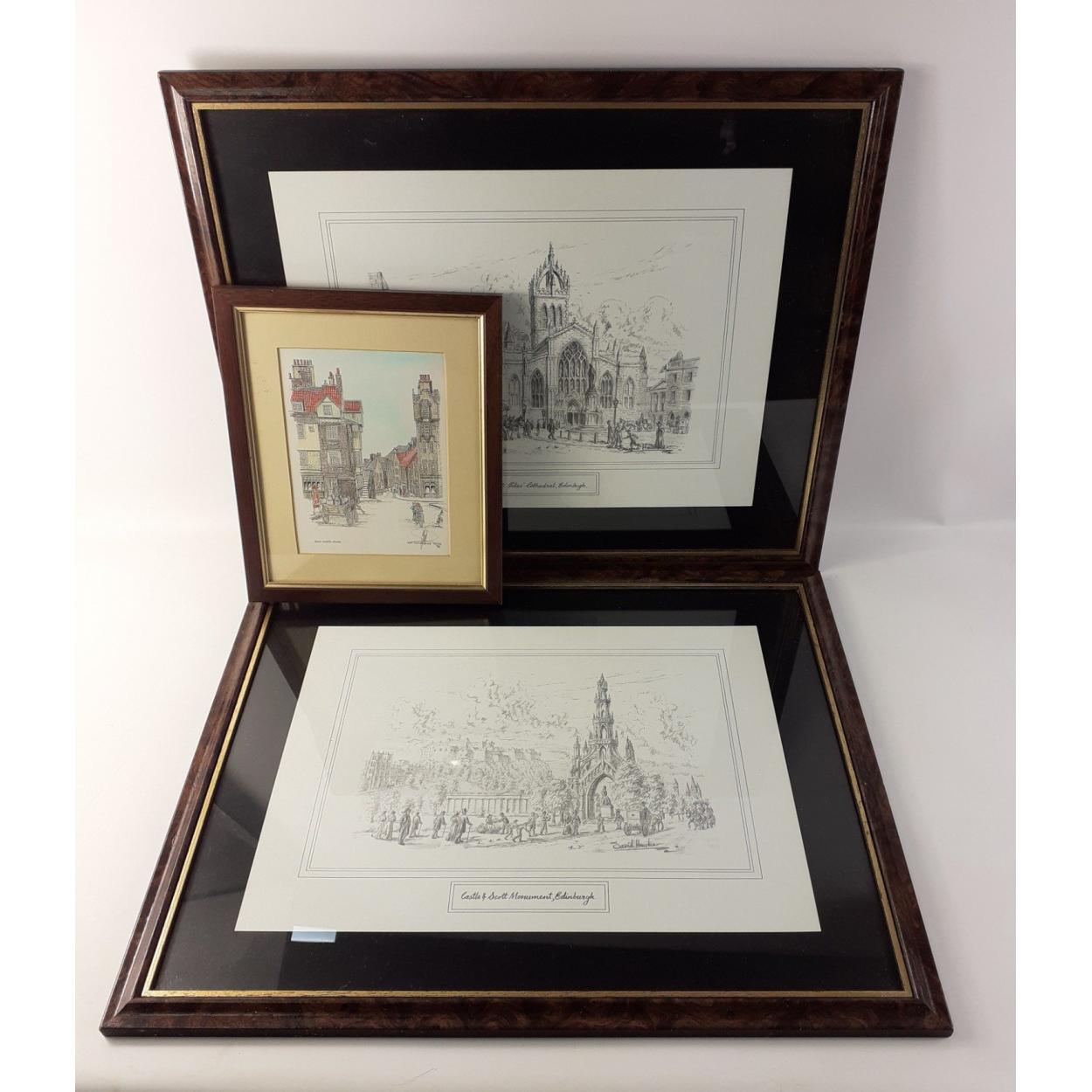 Three lovely prints of EDINBURGH interest to include a small McFarlane Young sketch of John Knox's House and a pair of David Hawker sketches of the Scott Monument and St Giles Cathedral. The two larger are 55 x 45 cm approx.