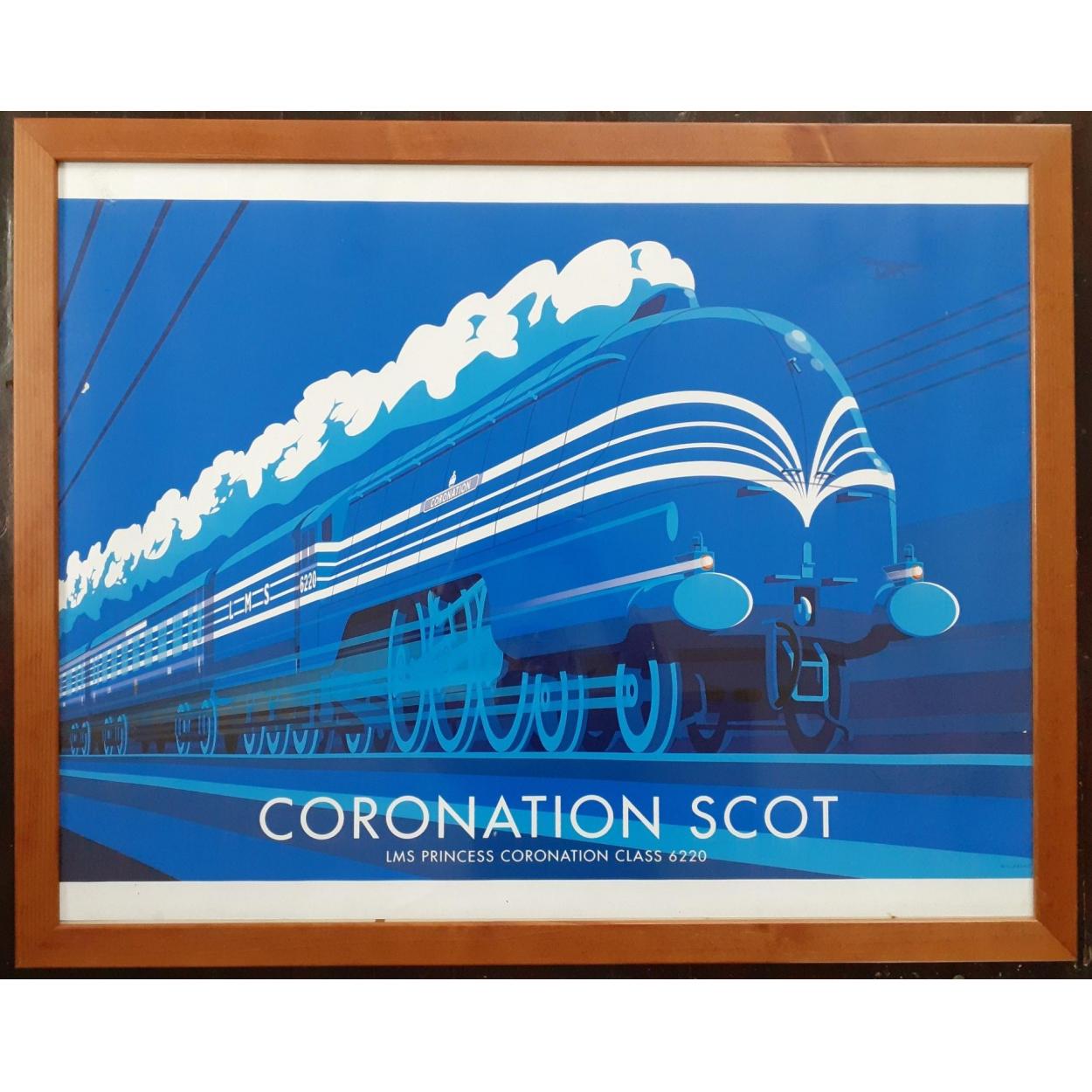 CORONATION SCOT superb framed large railway poster. Evocative of the romance of steam with this gorgeous blue framed poster depicting this wonderful locomotive at full speed. From an original image by Millership. The poster measures 100cm x 70cm and can be shipped in or out of the frame.