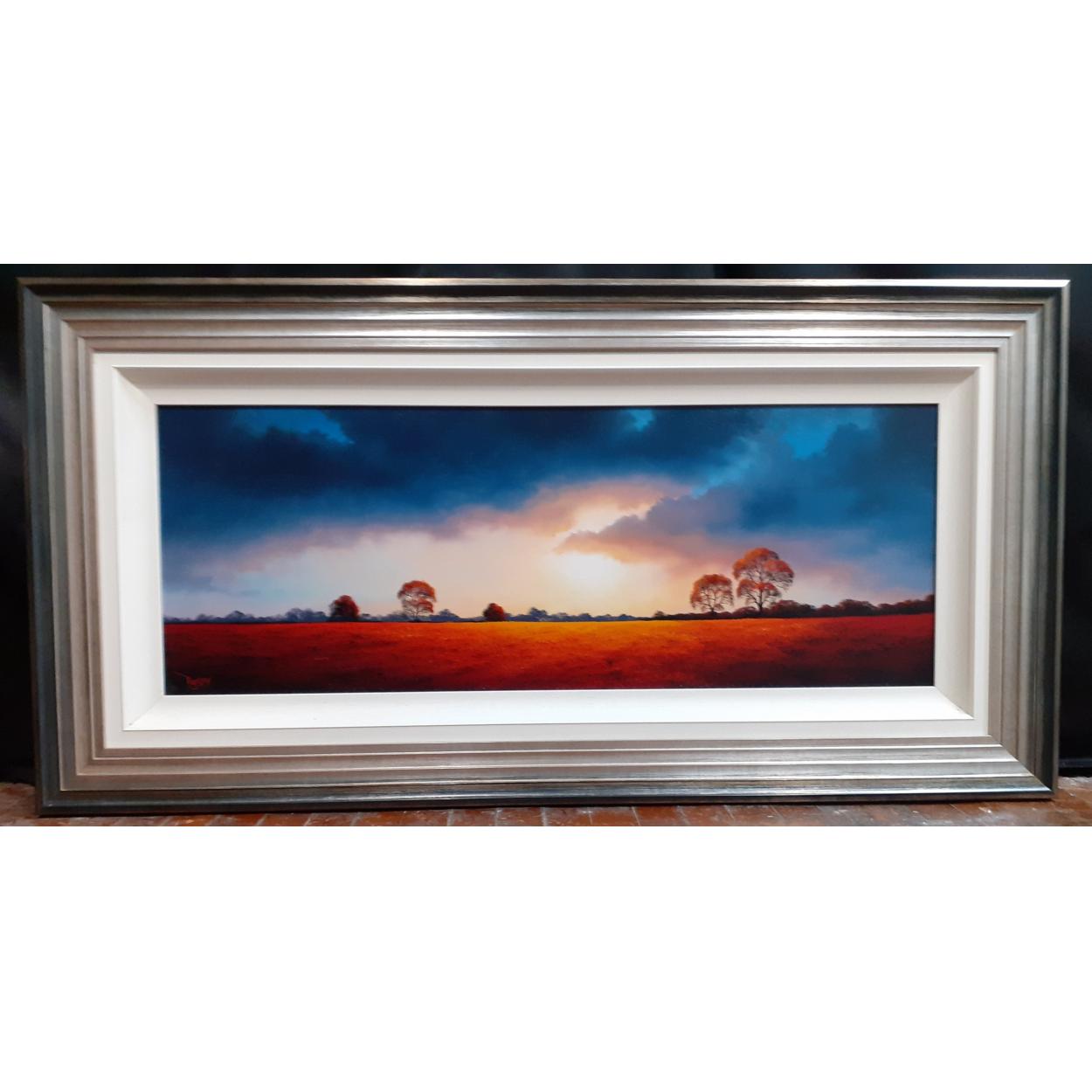 An ORIGINAL OIL ON BOARD PAINTING by DAVID RENSHAW of an atmospherically peaceful country meadow scene. Frame measures approx. 129cm in length x 65cm in height. Visible work measures approx. 100cm in length x 37cm in height. Comes with a signed Gallery sheet by David Renshaw showing the artwork in question.