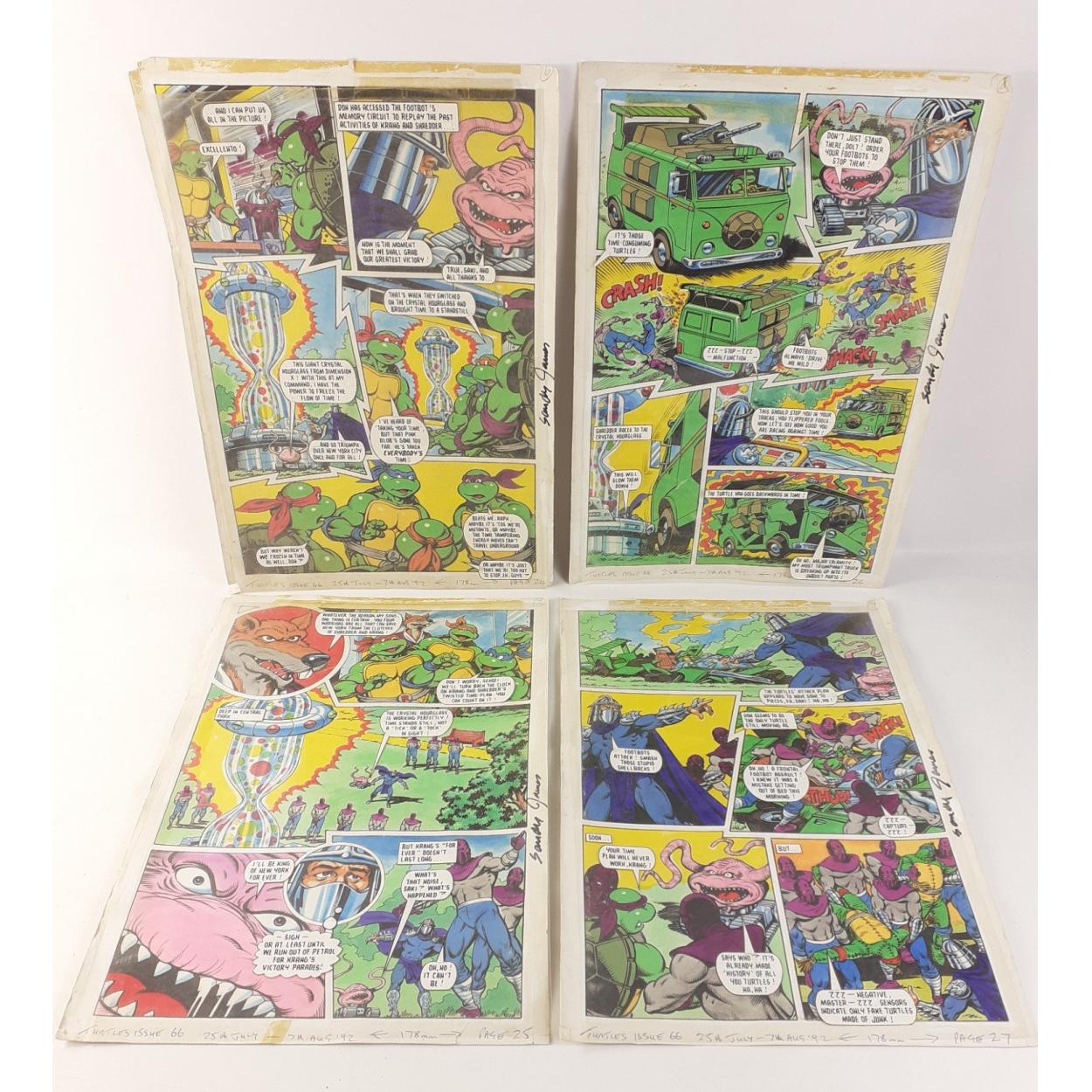 A rare opportunity to purchase original TEENAGE MUTANT HERO TURTLE artwork. This lot comprises FOUR pages (each 38x25cm approx) from the TMHT issue 66, 25th July - 7th August 1992, each signed by the artist SANDY JAMES and consists of pages 24 -27 inclusive. In addition each sheet comes with an acetate overlay page with the relevant speech bubbles. Each page has signs of sticky tape at the top - to be expected with working documents. Slight wear at edges. This is a seldom to be repeated chance to own such vibrant coloured work which played a part in so many childhoods.