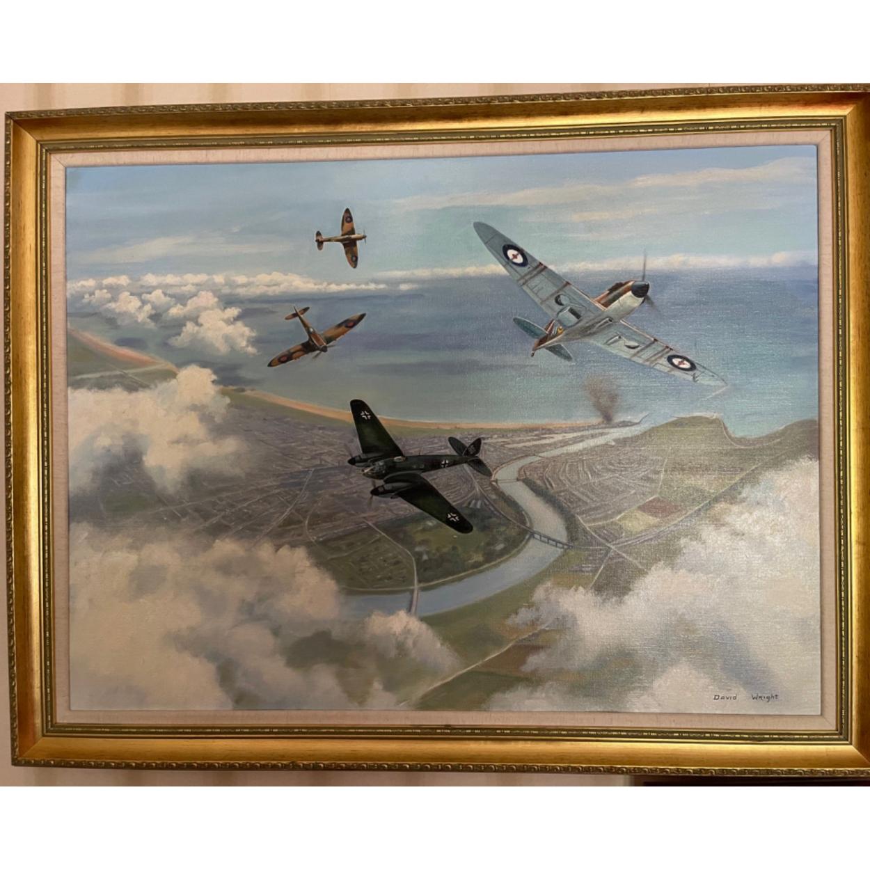 WWll BATTLE OF BRITAIN/ABERDEEN - A large canvas COLLECTORS COPY oil print by artist(and aviation pilot) DAVID WRIGHT - AIR BATTLE OVER ABERDEEN 12th JULY 1940 as witnessed by the artist as a boy of 14yrs - showing three spitfires engaging and blocking off a German HEINKEL 111H-3 based at STAVANGAR NORWAY which had just completed a bombing run in ABERDEEN and was attempting to head out seawardto escape - no match for the SPITFIRES blocking it's escape route out to sea and forced the Heinkel to crash into an uncompleted ice rink on South Anderson Drive! - all German crew were killed! Dimensions of the frame 44" x 35" approx - the painting comes with a 2 page A4 artist description and his witness accouint of th air-fight!