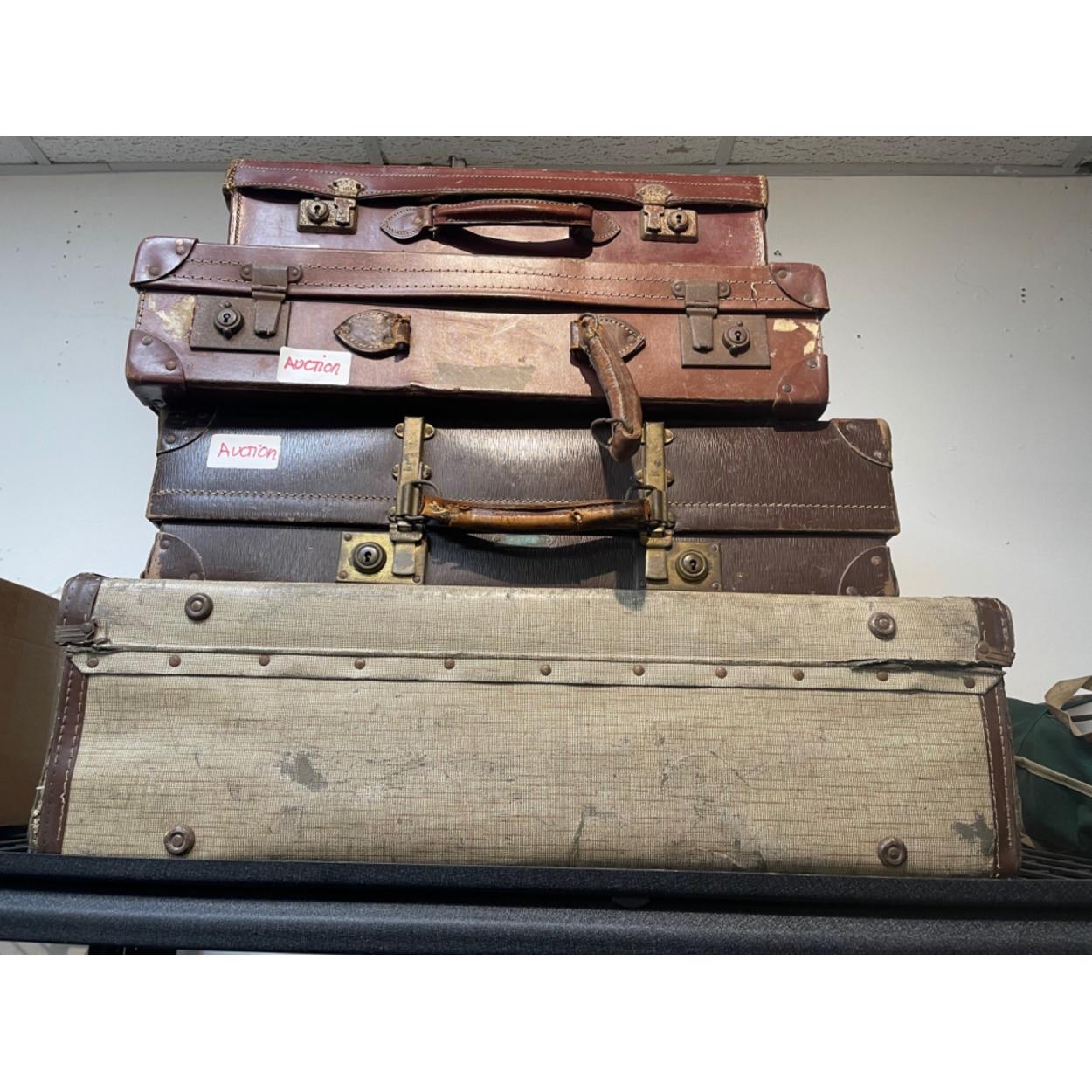 FOUR VINTAGE suitcases, 3 of which are in brown leather graduated sizes, the last and 4th suitcase finished in a faux woven vinyl - ideal storage items!