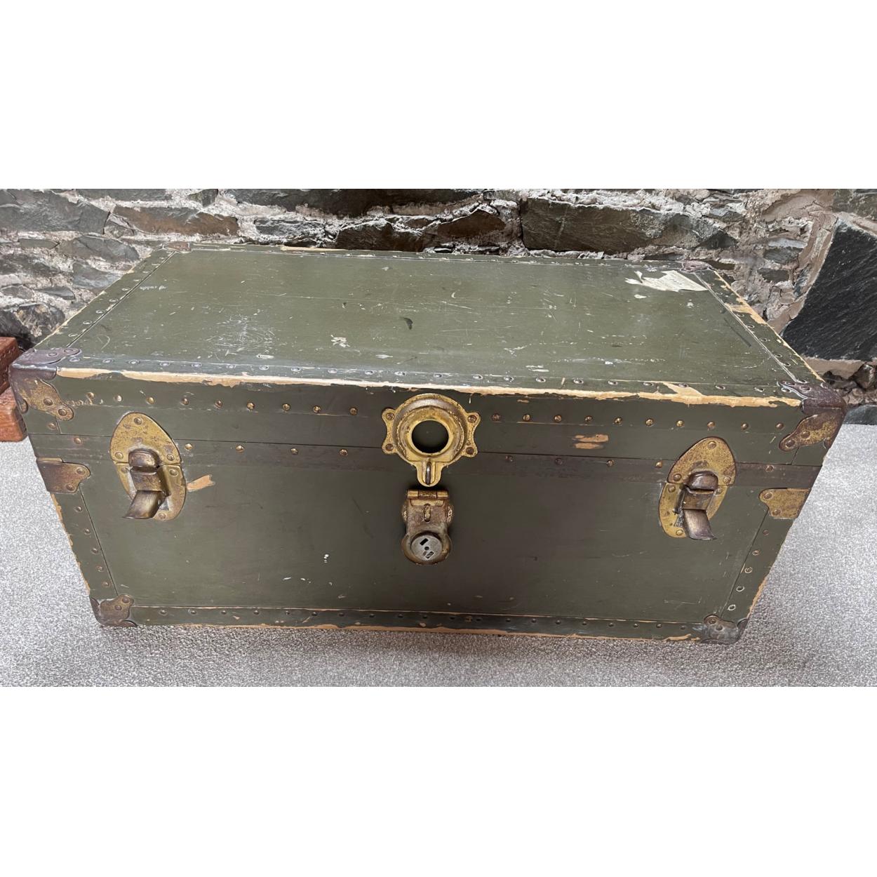 VINTAGE! A hard-shell travelling-trunk finished in green - with metal bindings - 80cm length x 43cm depth x 33cm height approx - LOVELY PATINA!
