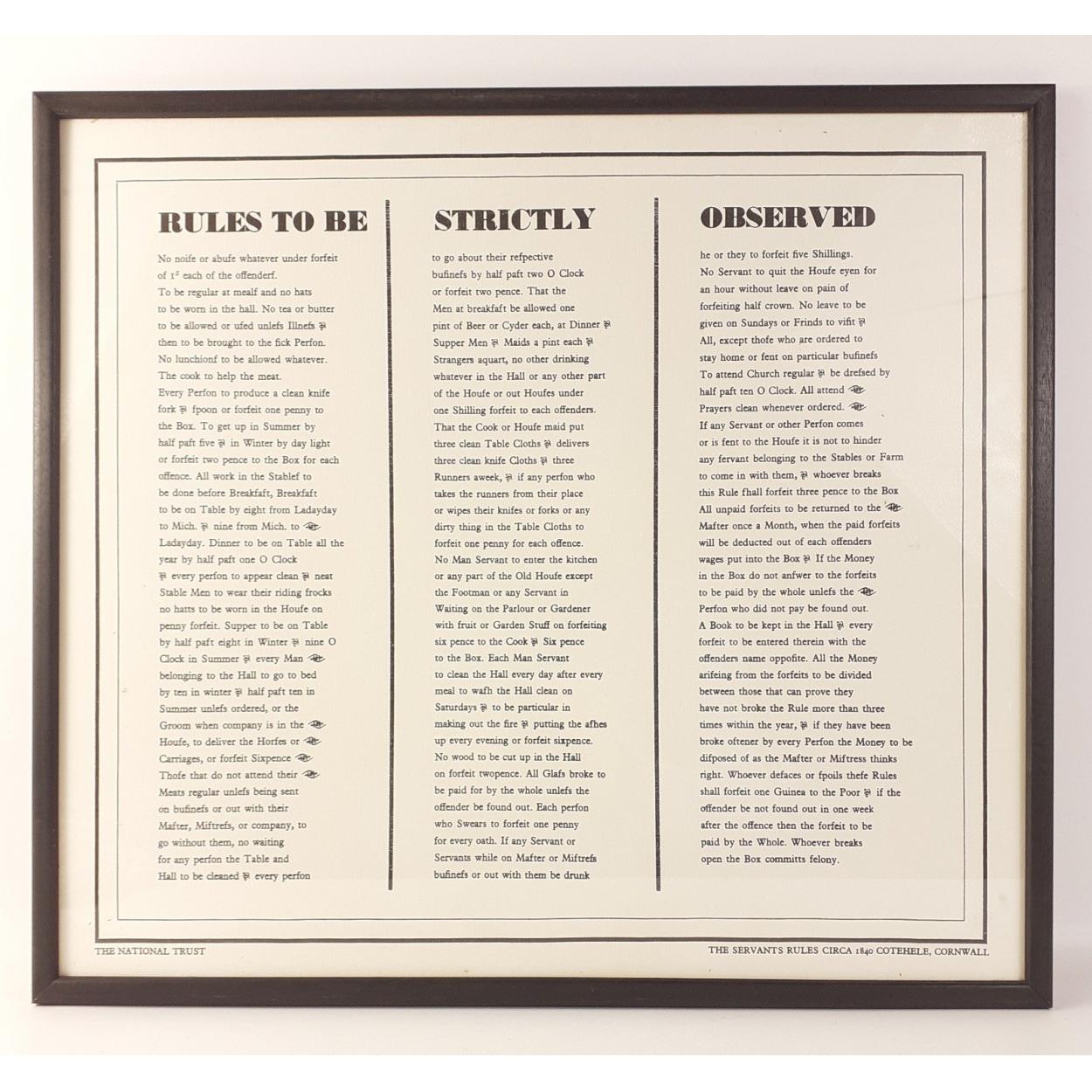 A framed print of THE SERVANTS RULES Ca. 1840 reproduced by the National Trust. Measures 47cm x 42cm. A fun thing.