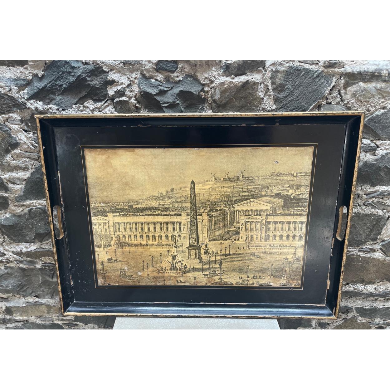 An ANTIQUE ebonised large serving tray with a varnished AMSTERDAM scene complete with windmills in the distance and the 'oversized' obelisk in the centre - dimensions of tray 21" x 17" approx