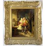 A 19th century IMPOSING Scottish School oil painting, no artist signature, in our opinion in the style of William Kidd HRSA Scottish | Circa 1790 - 1863 , oil on canvas Scottish Country Scene circa 1830's of an elderly couple sitting by the fireside, frame size 93 x 81cm, visible canvas 66cm x 53.5cm, the gesso frame needs some repair (but most has been saved within a separate bag)