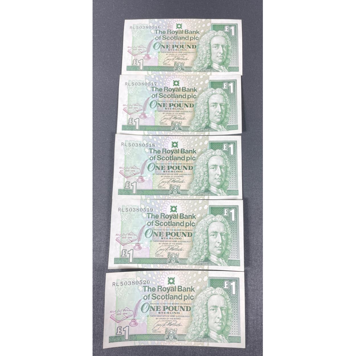 A sequential run of five ROYAL BANK OF SCOTLAND one pound notes (RLS0380516 -RLS380520) with Robert Louis Stevenson on the reverse