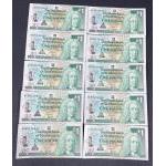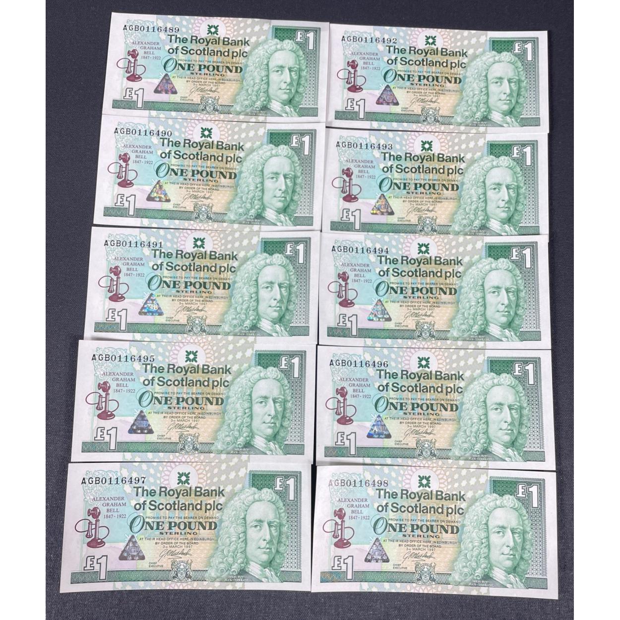 A sequential run of ten ROYAL BANK OF SCOTLAND one pound notes (AGB0116489 - AGB0116498), in mint condition with Alexander Graham Bell on the reverse