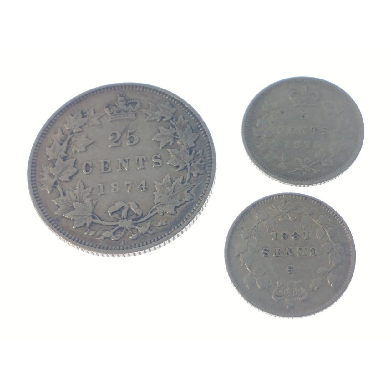 A collection of three silver coins to include. VICTORIA 1874 SILVER Canadian 25 Cents coin and two 5 cents VICTORIA 1883 and 1881 5 cents Canadian coin