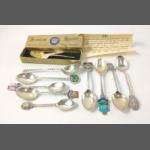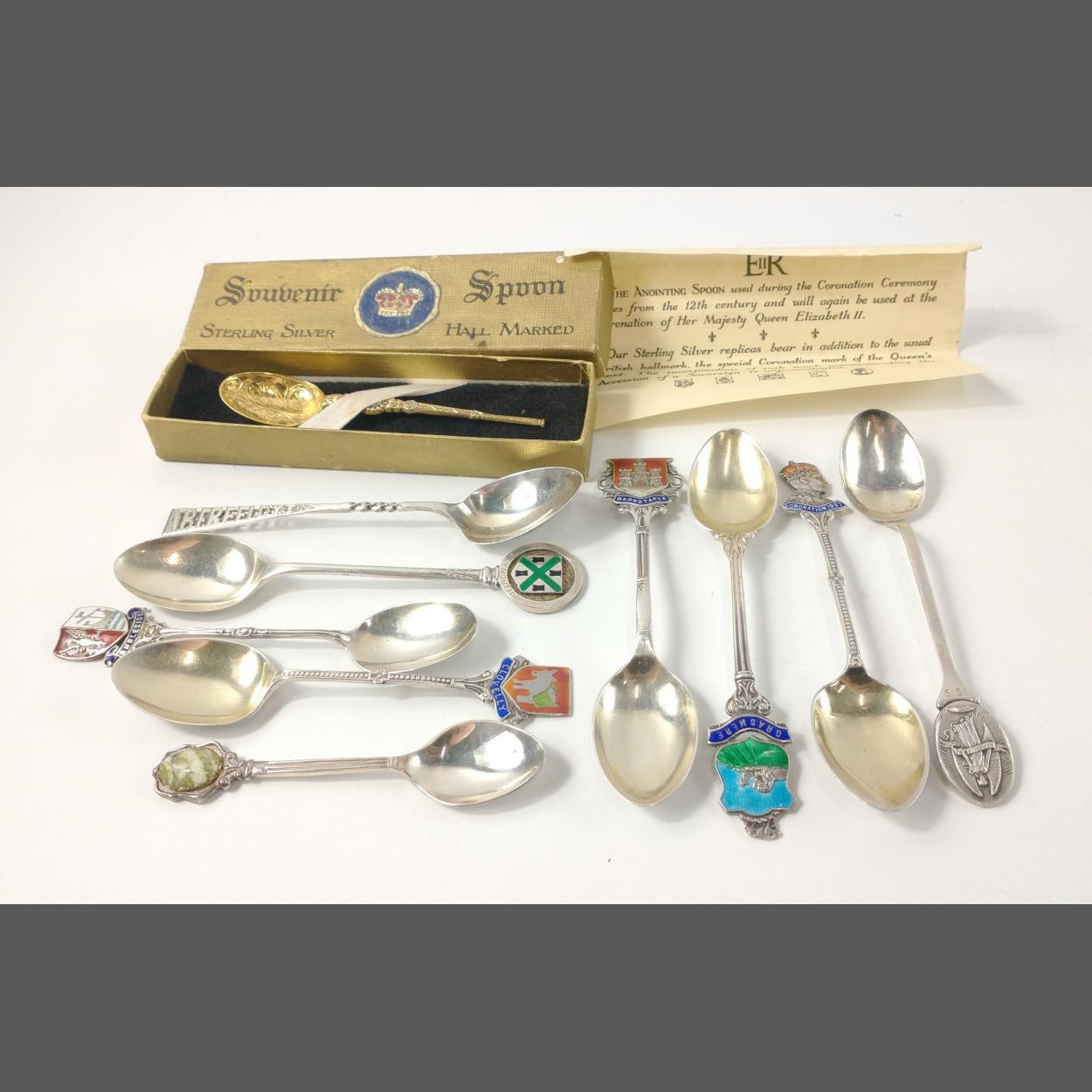 Nine silver hallmarked collectors' spoons from around the UK, gross weight 110g plus a boxed sterling silver (Birmingham 1952) anointing spoon as used at the coronation of Queen Elizabeth gross weight 8g