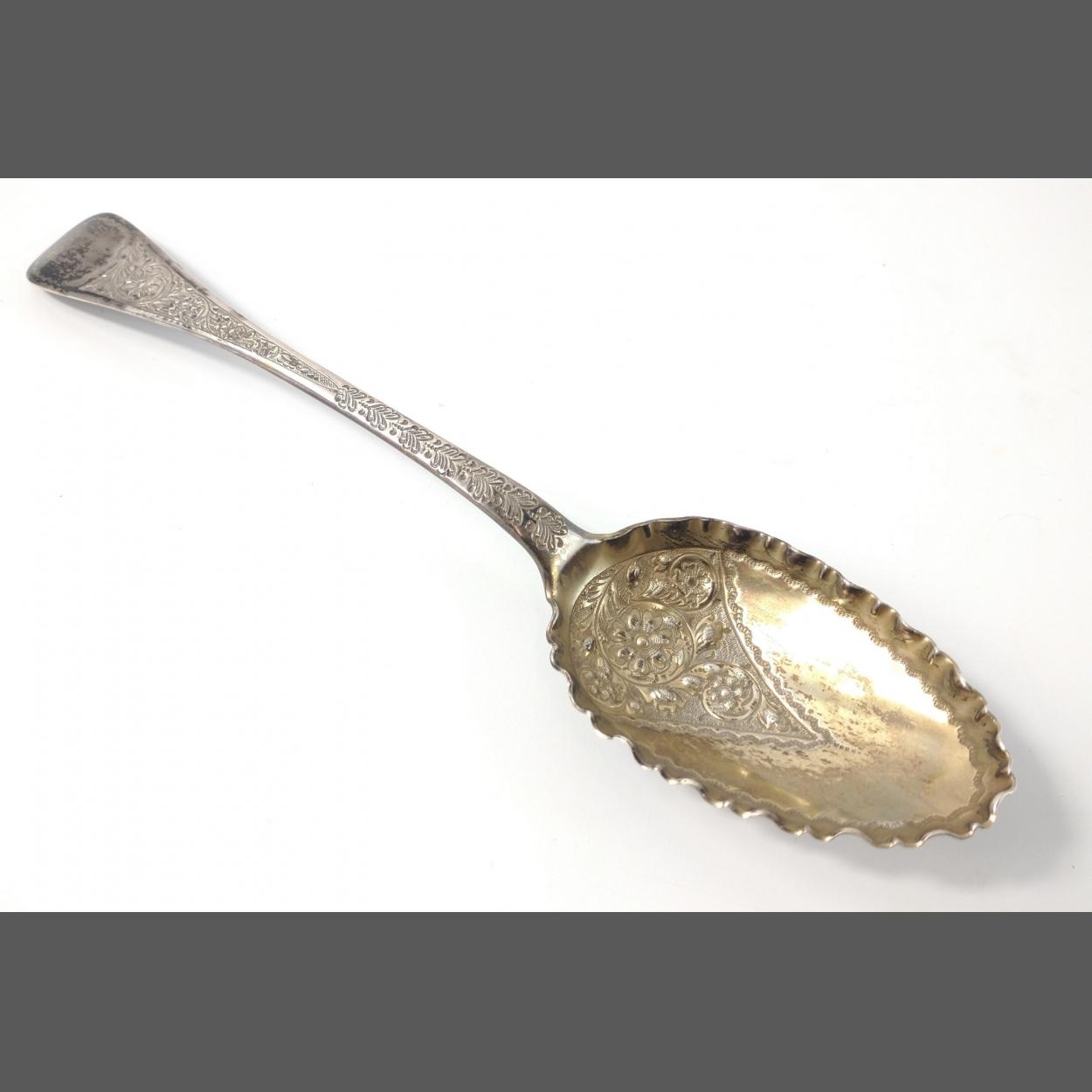 A hallmarked, Edinburgh 1819, ornate silver serving spoon 23cm long, gross weight 55g. Possibly made by Alexander Henderson but mark very rubbed
