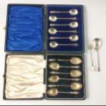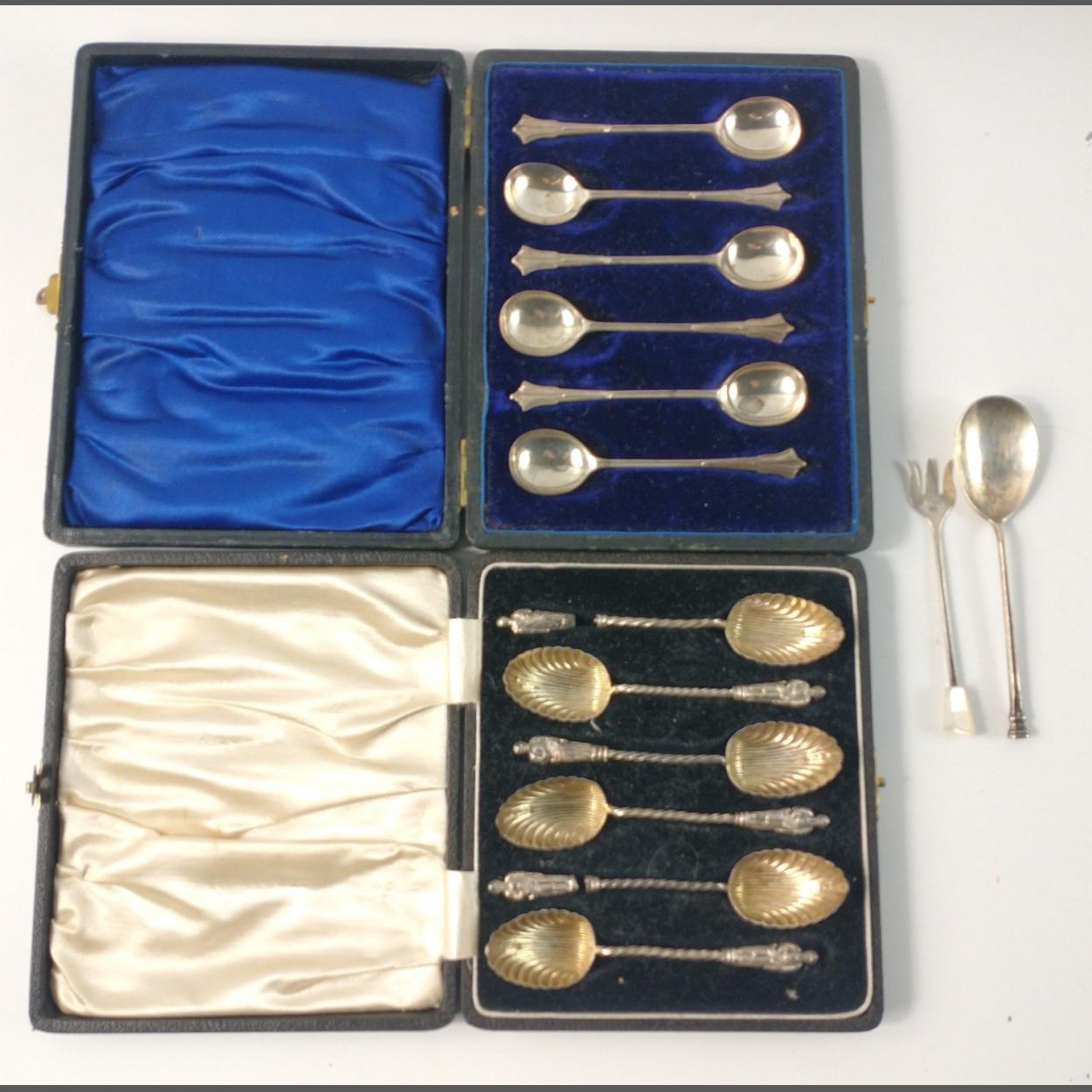 A boxed set of silver hallmarked, Birmingham 1936, coffee spoons by AJ Bailey gross weight 30g, a boxed set of 6 hallmarked silver apostle spoons (2 broken) Birmingham 1900, gross weight 35g plus a teaspoon hallmarked Sheffield 1936, by Lee & Wigfull, gross weight 13g and a pickle spoon, Sheffield 1936, gross weight 5g