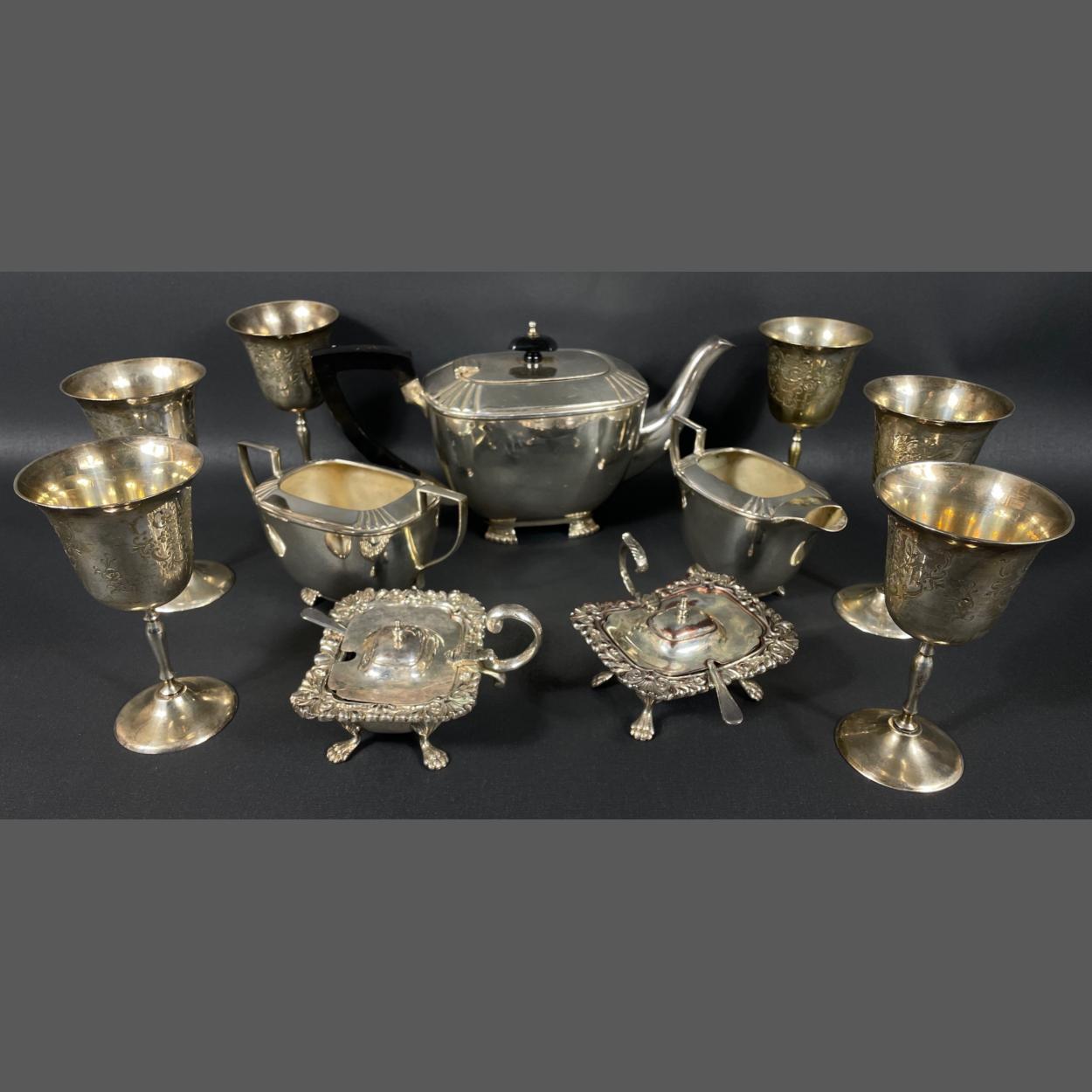 A mixed lot of metalware, mainly EPNS, to include a tea service, 6 goblets, 2 condiment dishes on 4 legs with handles shaped like scorpion tails complete with blue glass liners and spoons (10x9x4cm)