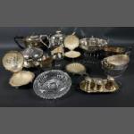 An EPNS tea service by Thomas Otley & Sons plus various lidded dishes with glass liners shaped as walnuts or scallops and a 3 piece cruet set on its own tray with glass liners and spoon for the mustard dish