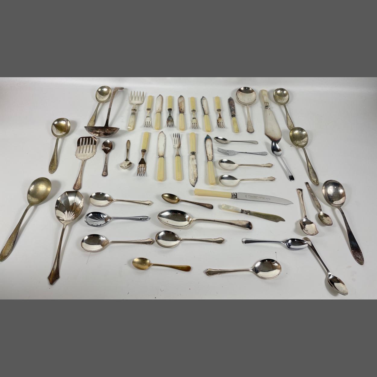 A quantity of silver-plated cutlery to include fish knives and forks, soup spoons, serving spoons etc