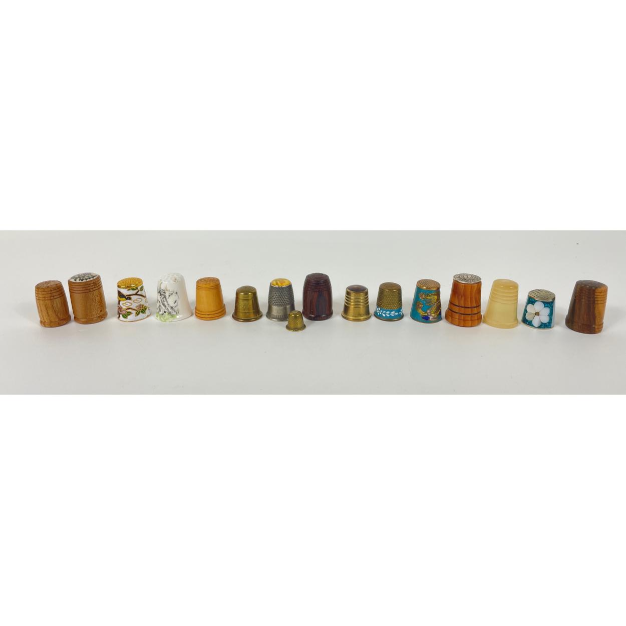 A collection of THIMBLES, to include several turned-wood, one with a silver threepenny coin on top, 4 cloisonne, 1 Ken Parry bone china and a tiny baby sized one